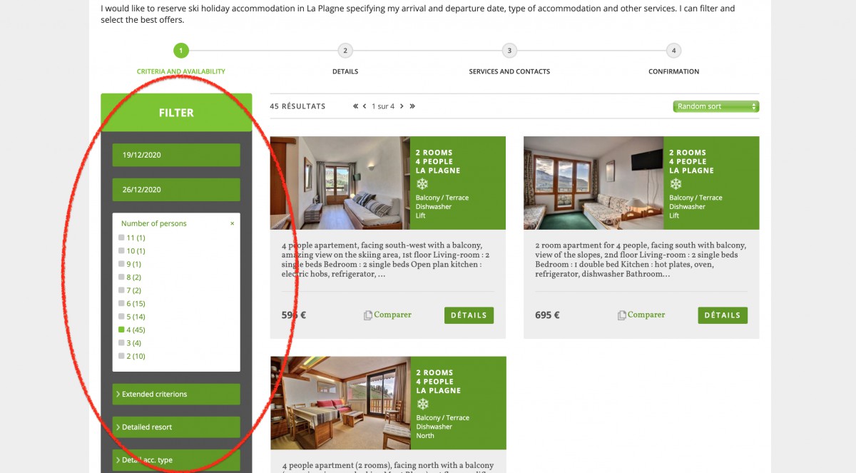 Sélectionnez votre date d’arrivée, le nombre de personnes, ainsi que d’autres critères, tels que balcon, animaux acceptés ou accès PMR. Vous pouvez également choisir votre lieu de résidence, par exemple, Plagne Centre, Belle Plagne, Plagne Soleil… Vous pouvez également décider de ne sélectionner aucun critère spécifique, vous pourrez ainsi découvrir une sélection complète de nos biens disponibles. Bien entendu, et grâce au critère « type de lot détaillé », vous avez la possibilité de sélectionner le type d’hébergement, du studio 2 personnes au chalet 15 personnes.