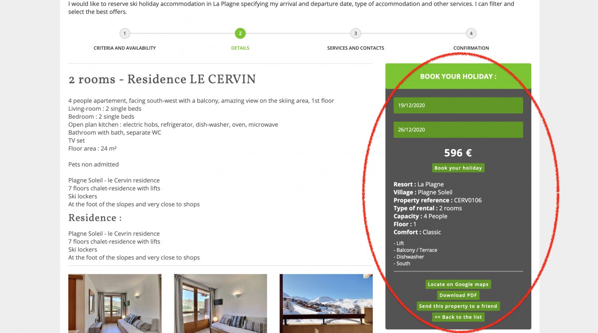Une fois arrivé sur la page détaillant l’hébergement choisi, vous pouvez découvrir en détail les particularités de la location. Vous trouverez notamment un descriptif précis, de nombreuses photos et plans, les coordonnées GPS (Google map), vous avez également la possibilité d’adresser une fiche PDF à un ami ou de la télécharger vous-même pour pouvoir la consulter plus tard.