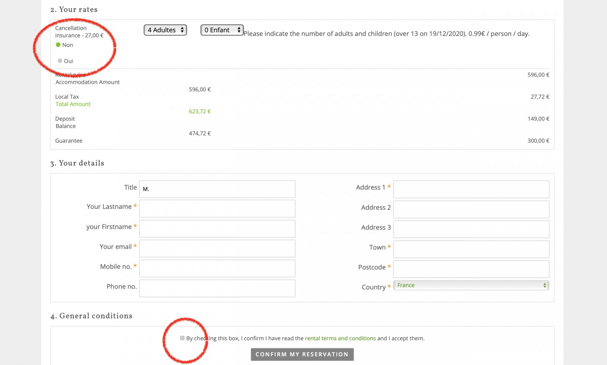 Juste en dessous, vous devez sélectionner le nombre d’adultes et d’enfants, le choix de l’assurance annulation (ou non, mais fortement recommandée). Le montant total de votre séjour s’affichera ensuite, ainsi que l’acompte demandé. Le versement de l’acompte de 25% est nécessaire pour confirmer définitivement votre réservation. Le solde est exigible un mois avant le début de votre séjour. Assurez-vous de remplir correctement la rubrique « Vos coordonnées », ces infos seront en effet utilisées pour la création de votre espace client. Cochez ensuite la case concernant les conditions générales de location et cliquer sur le bouton gris « Valider ma réservation ». Vous serez ensuite dirigé vers notre site de paiement sécurisé. Si vous souhaitez vous laisser quelques jours de réflexion avant de confirmer, restez-en là, votre option est enregistrée dans l’attente de votre paiement.