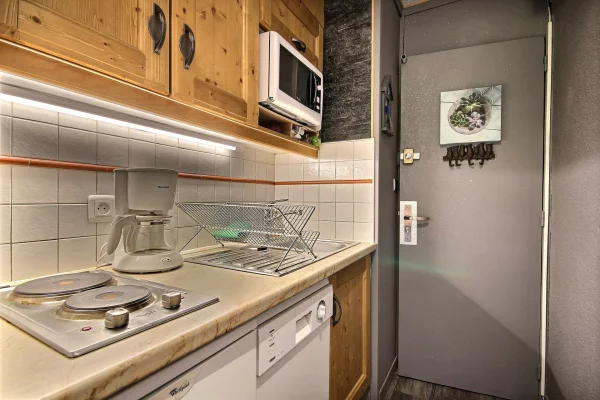Coin cuisine dans l'entrée avec plaques électriques, réfrigérateur, four mixte, lave-vaisselle