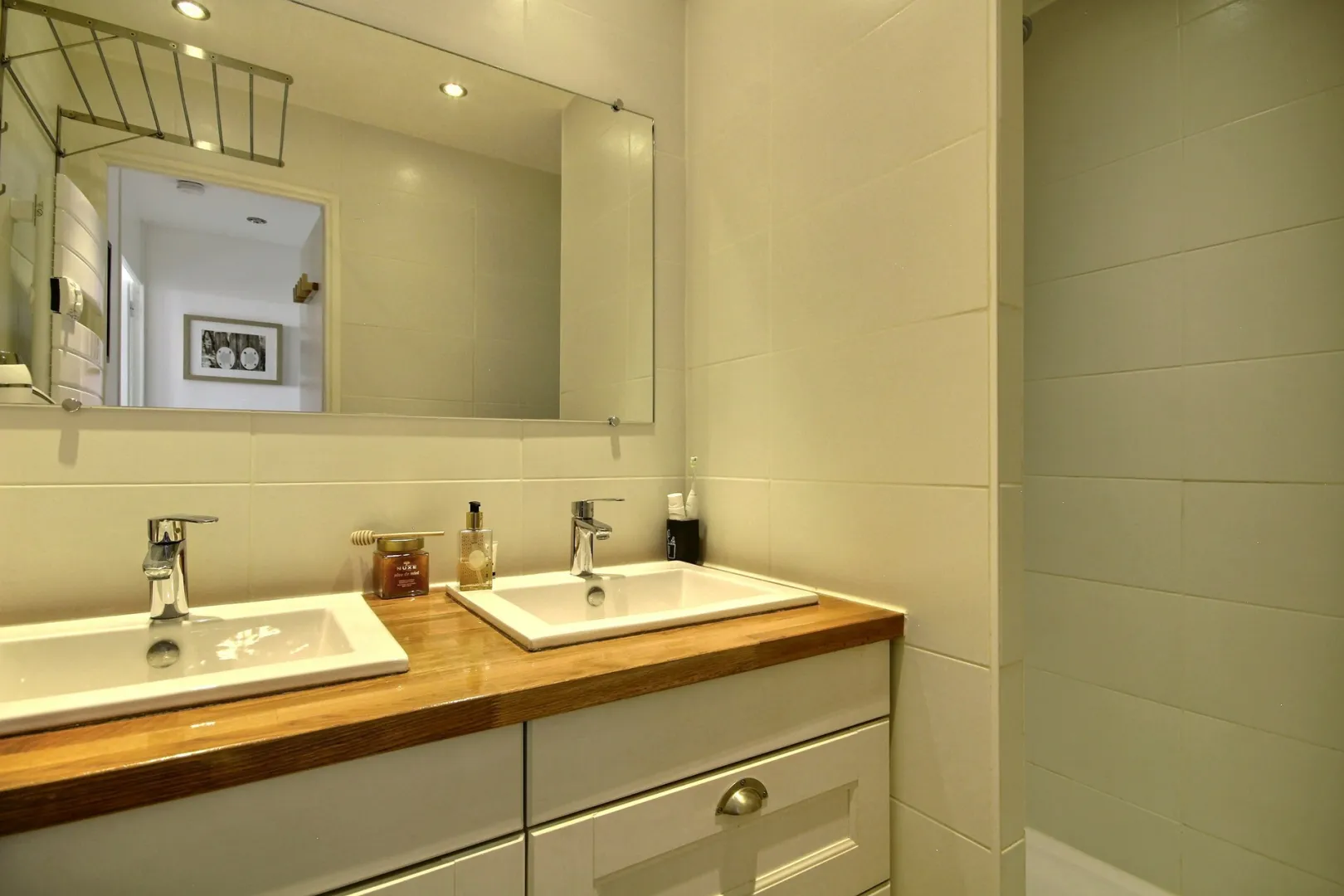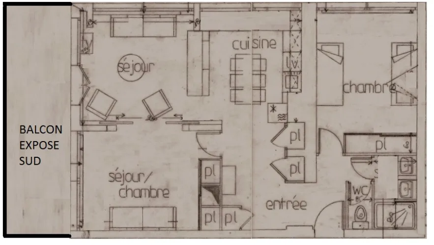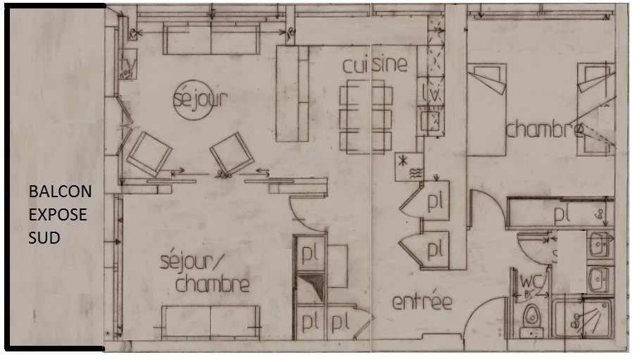 Large pièce à vivre divisible (porte coulissante) ouvrant sur le balcon : coin séjour/repas et télévision d'un côté, 1 canapé-lit double (160cm) de l'autre côté