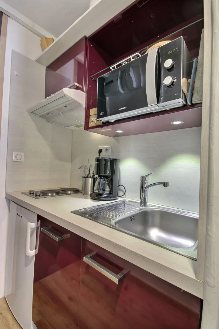 Coin cuisine dans l'entrée : plaques électriques, réfrigérateur, micro-ondes, lave-vaisselle