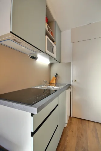 Coin cuisine dans l'entrée : plaques induction, réfrigérateur, lave-vaisselle, micro-ondes