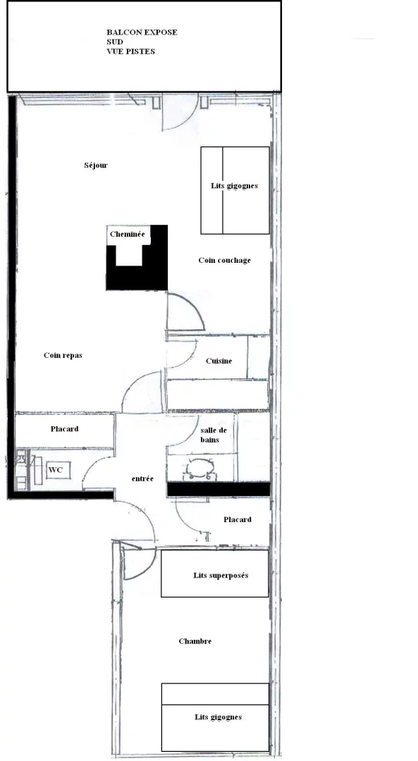 Appartement 2/3 pièces divisible 6 personnes, orienté sud avec balcon (vue front de neige et pistes), 3ème étage (sans ascenseur)