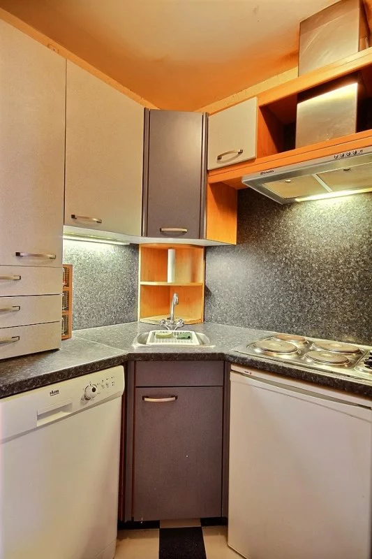 Cuisine séparée : plaques électriques, four mixte (gril/micro-ondes), réfrigérateur, lave-vaisselle