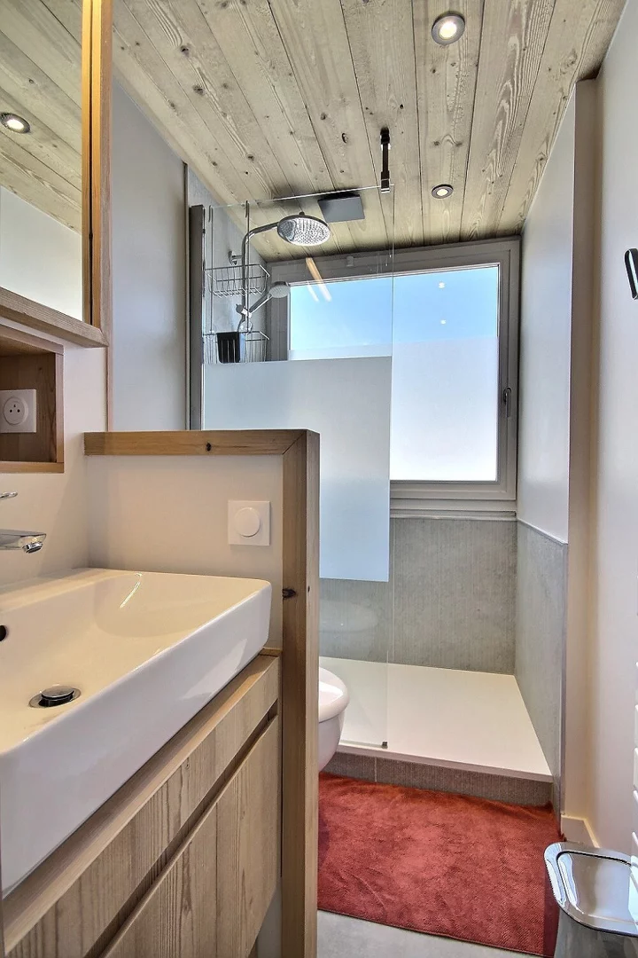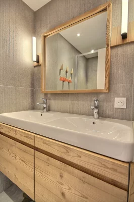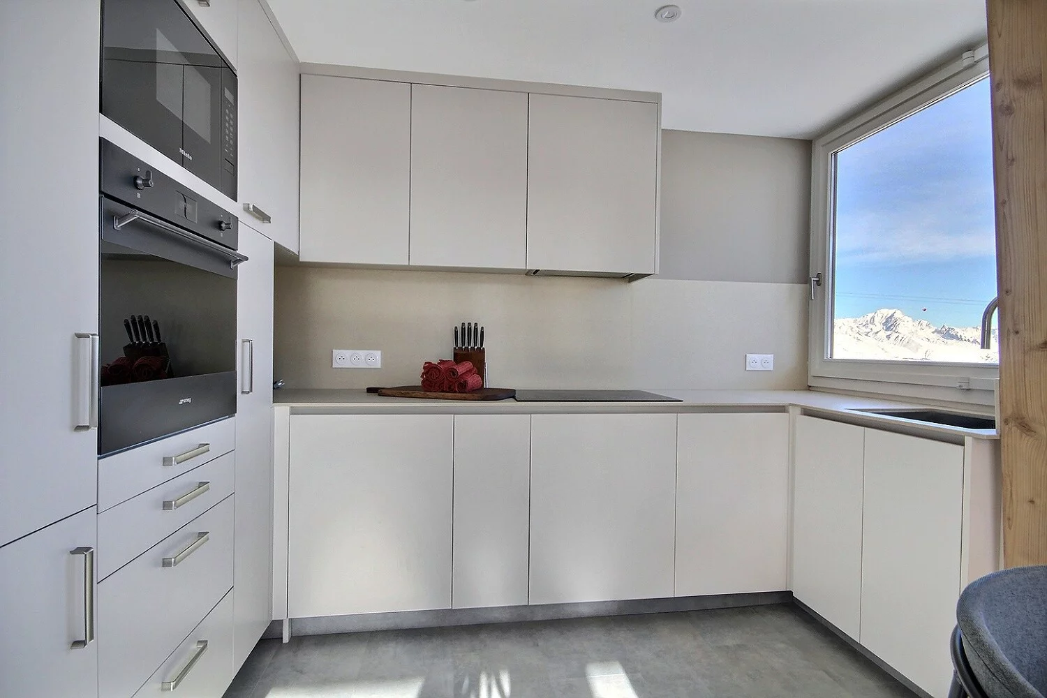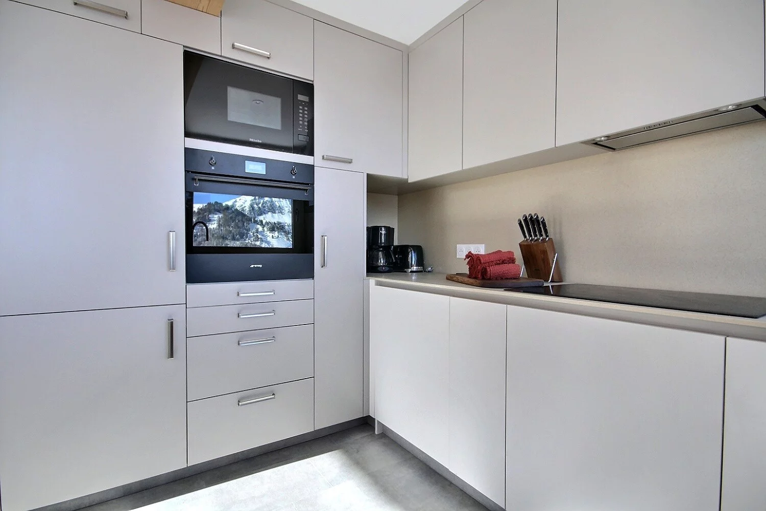 - cuisine entièrement équipée ouverte sur le séjour : plaques à induction, four, réfrigérateur, lave-vaisselle, micro-ondes, lave-linge séchant, machine à café, bouilloire, grille-pain..