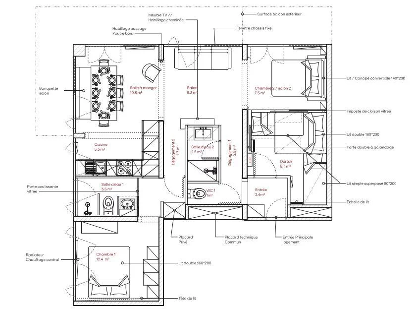 - partie séjour/couchage : 1 canapé-lit de 2 personnes (140 x 200 cm)