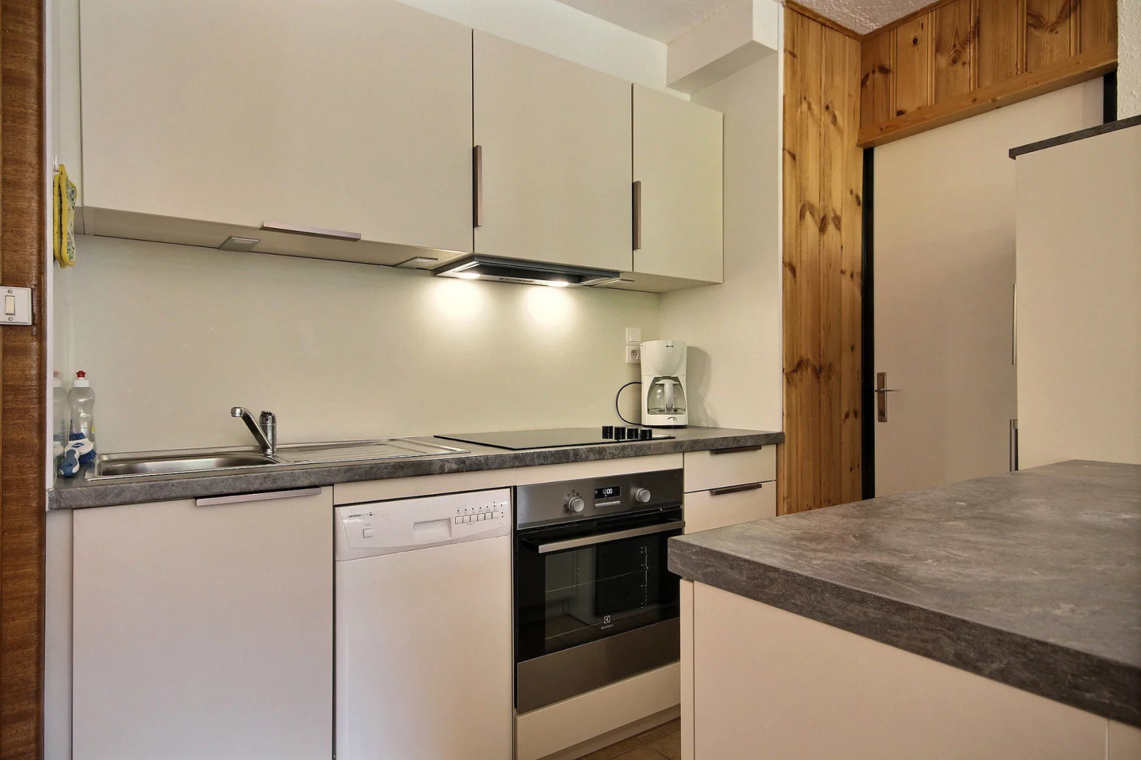 Cuisine ouverte sur le séjour : plaques vitrocéramiques, four, réfrigérateur, lave-vaisselle, micro-ondes