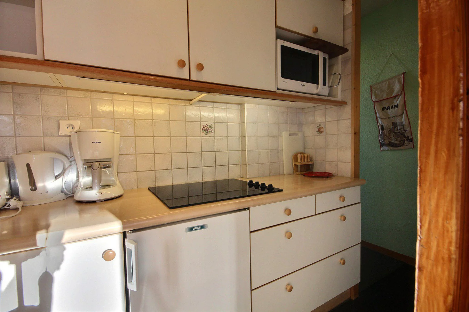 Coin cuisine équipée : plaques électriques, four, réfrigérateur, lave-vaisselle, micro-ondes