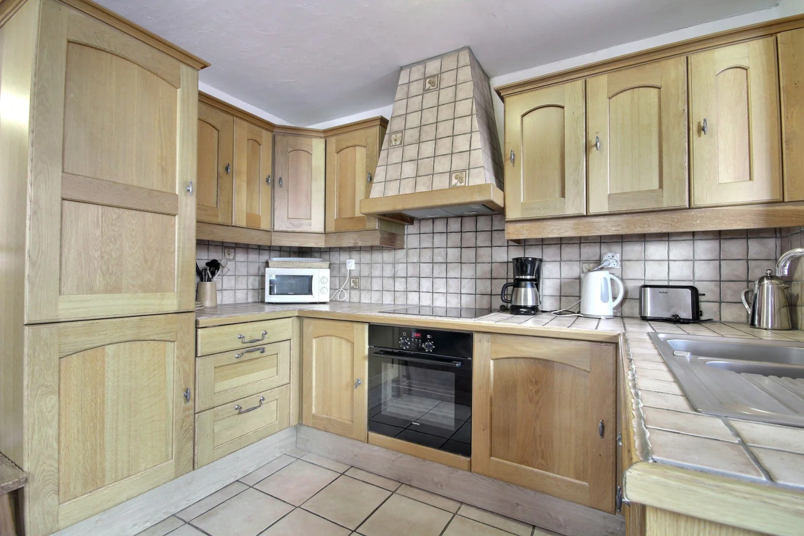 Cuisine ouverte sur le séjour : plaques vitrocéramiques, four, réfrigérateur, congélateur, lave-vaisselle