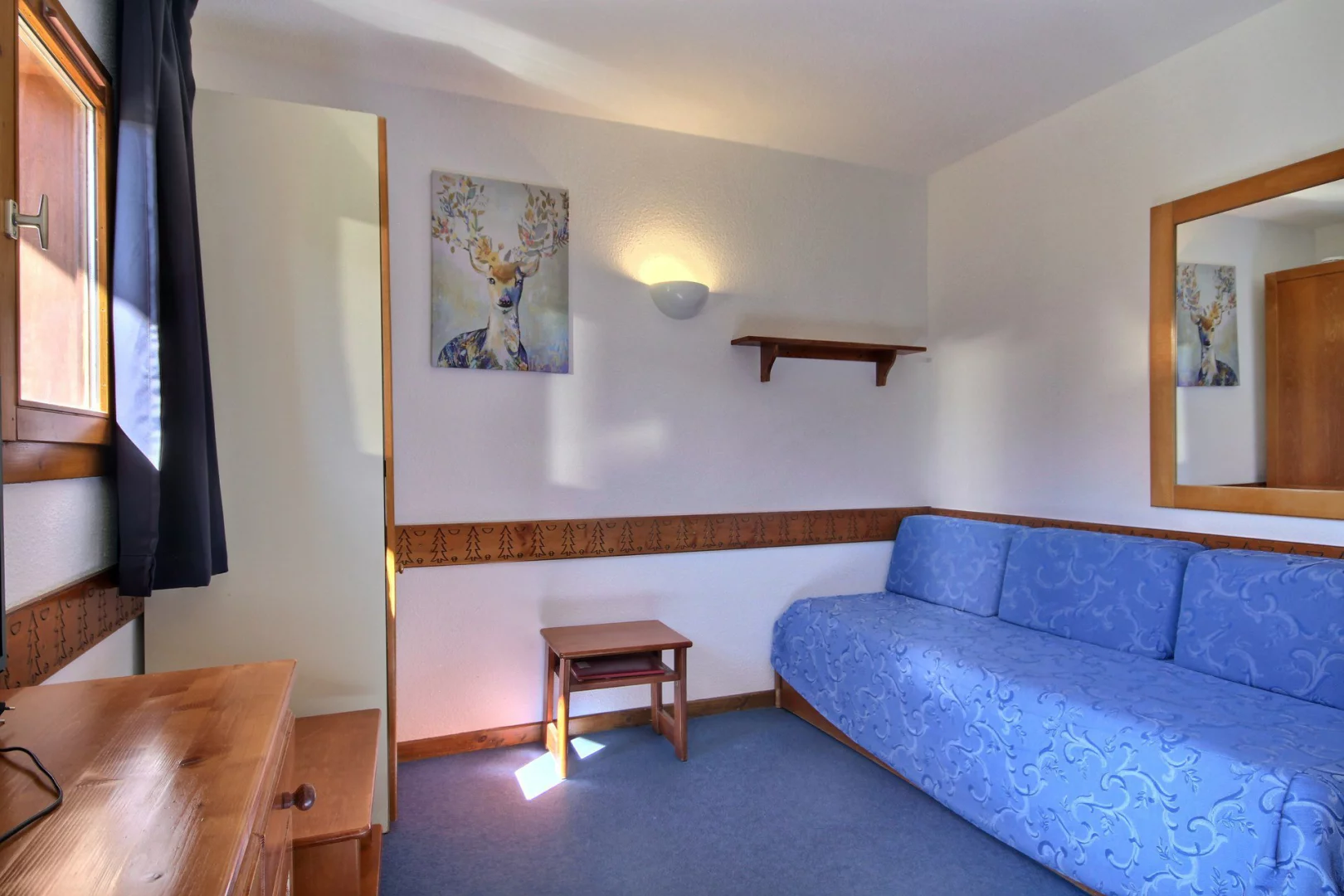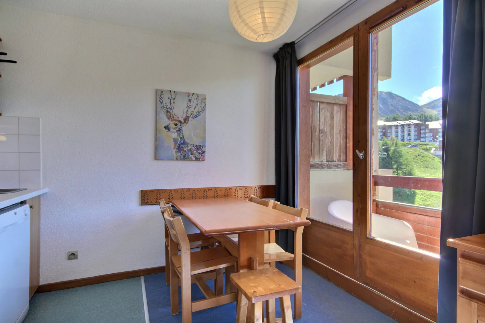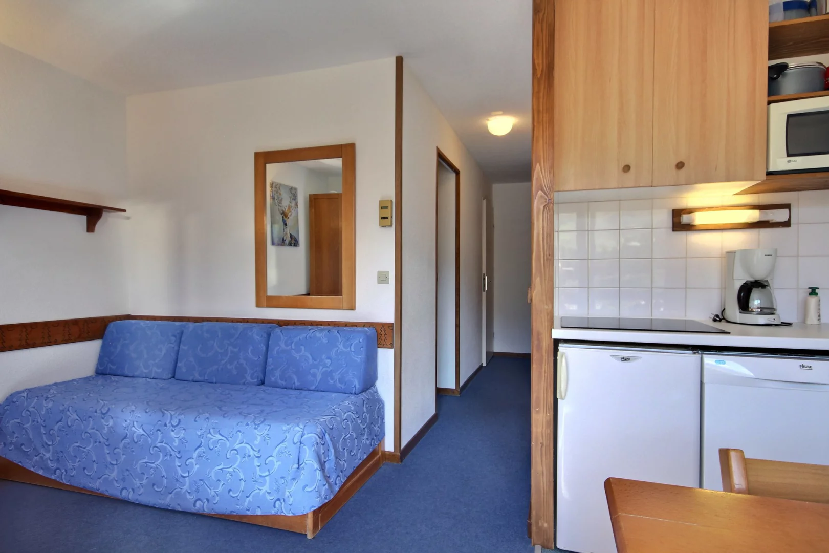Séjour ouvrant sur le balcon : 1 banquette-lit gigogne (80cm) pour 2 personnes, coin repas pouvant accueillir 4 à 5 convives