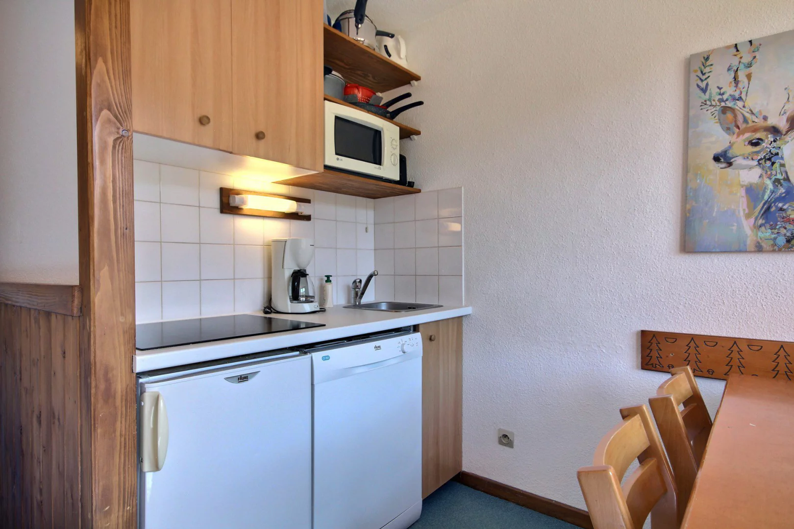 Coin cuisine ouvert sur le séjour : plaques électriques, four, réfrigérateur, lave-vaisselle