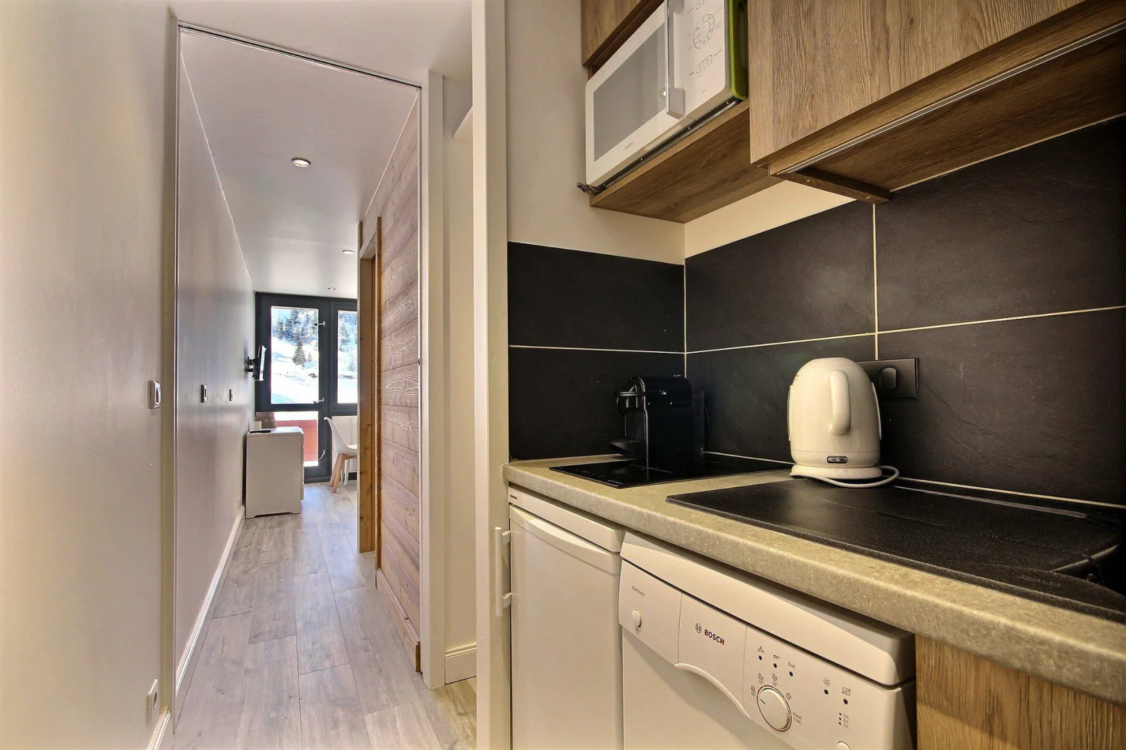 Coin cuisine dans l'entrée avec plaques vitrocéramiques, réfrigérateur, four mixte, lave-vaisselle