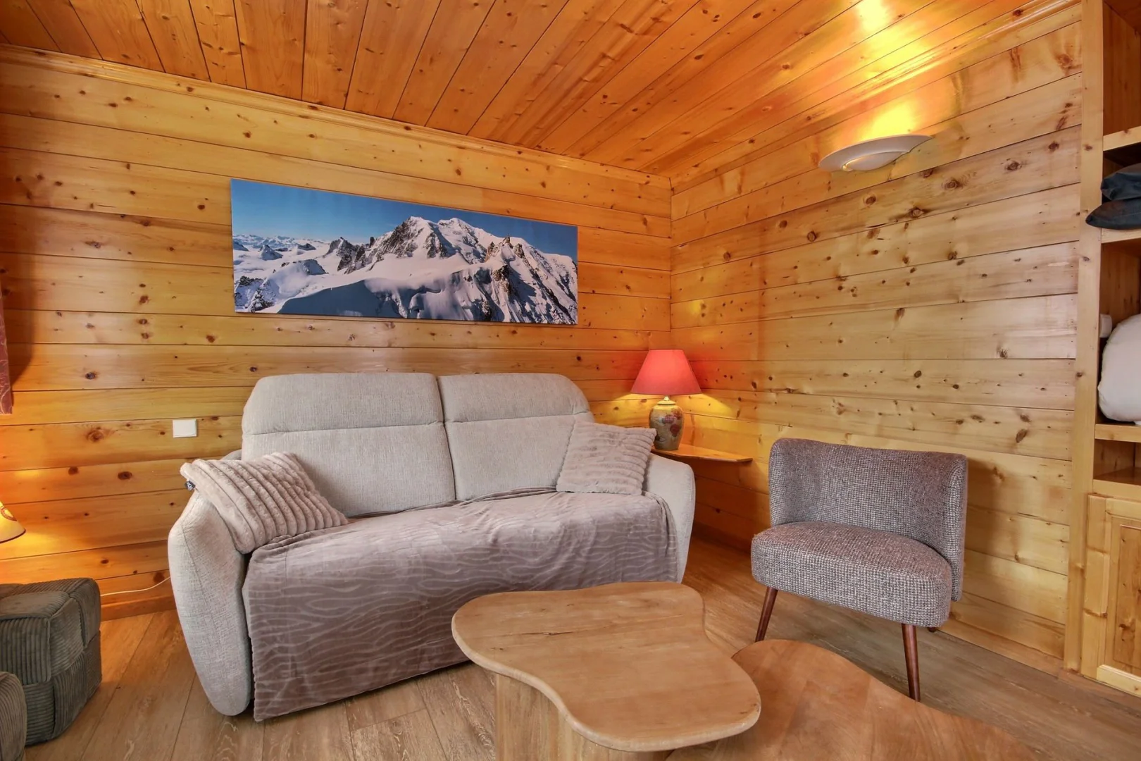 Séjour divisible ouvrant sur le balcon : d'un côté coin repas, de l'autre côté, séjour avec 1 canapé-lit double
