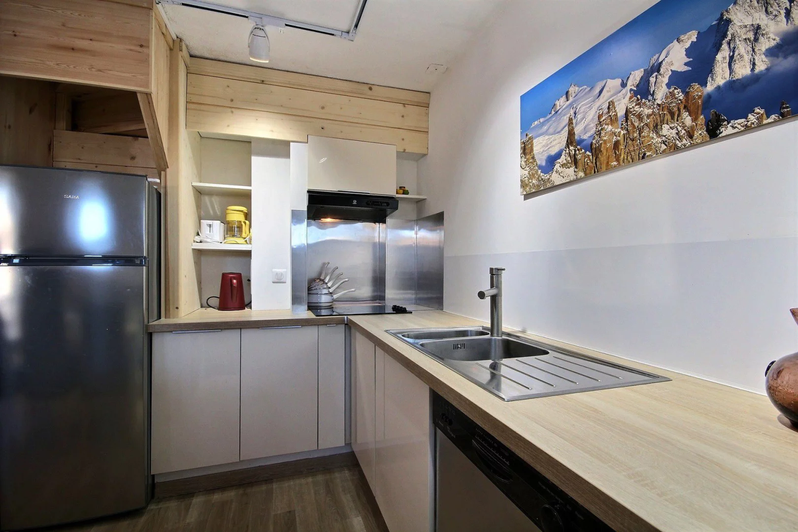 Cuisine ouverte sur le séjour : plaques vitrocéramiques, four, réfrigérateur/congélateur, micro-ondes, lave-vaisselle