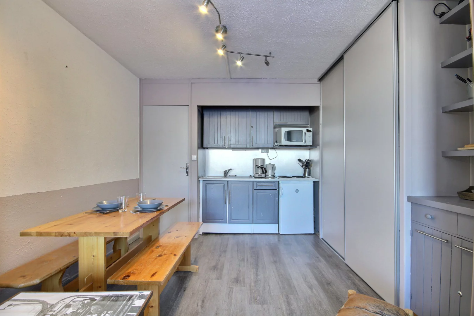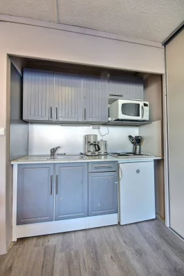 Coin cuisine équipé : plaques électriques, four micro-ondes, réfrigérateur