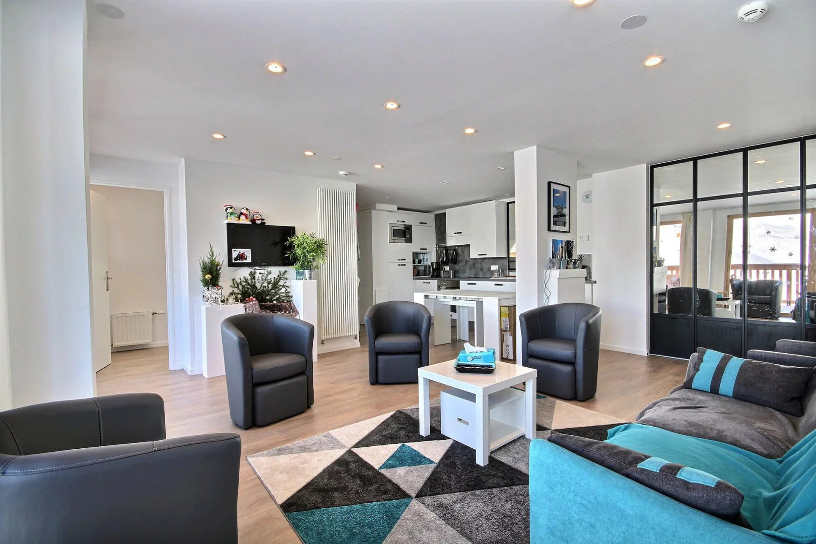 Grand séjour ouvrant sur le balcon avec coin repas, Télévision