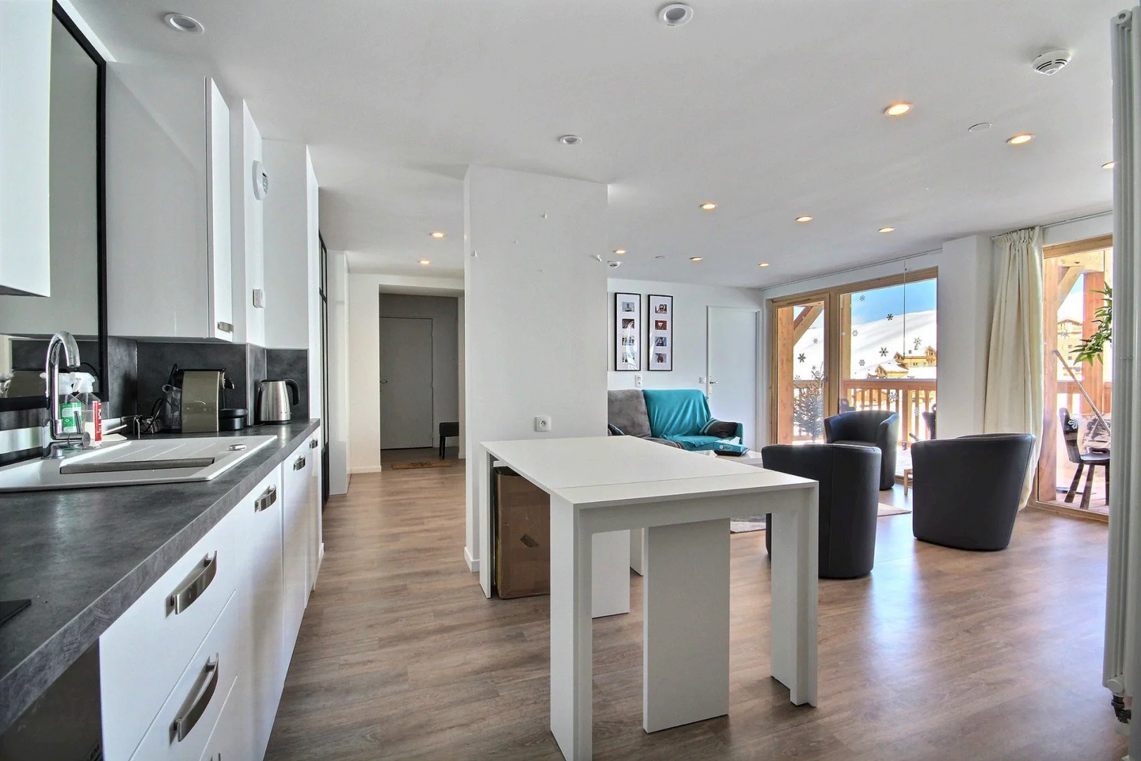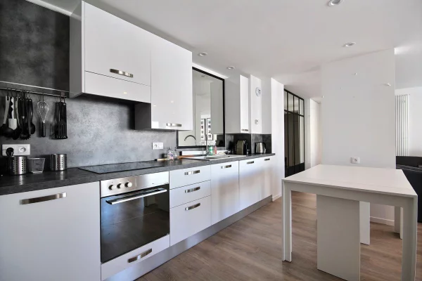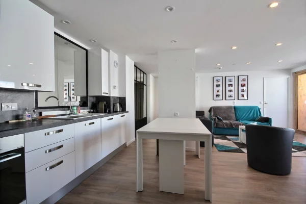 Cuisine ouverte sur le séjour : plaques à induction, four, four micro-ondes, réfrigérateur, lave-vaisselle