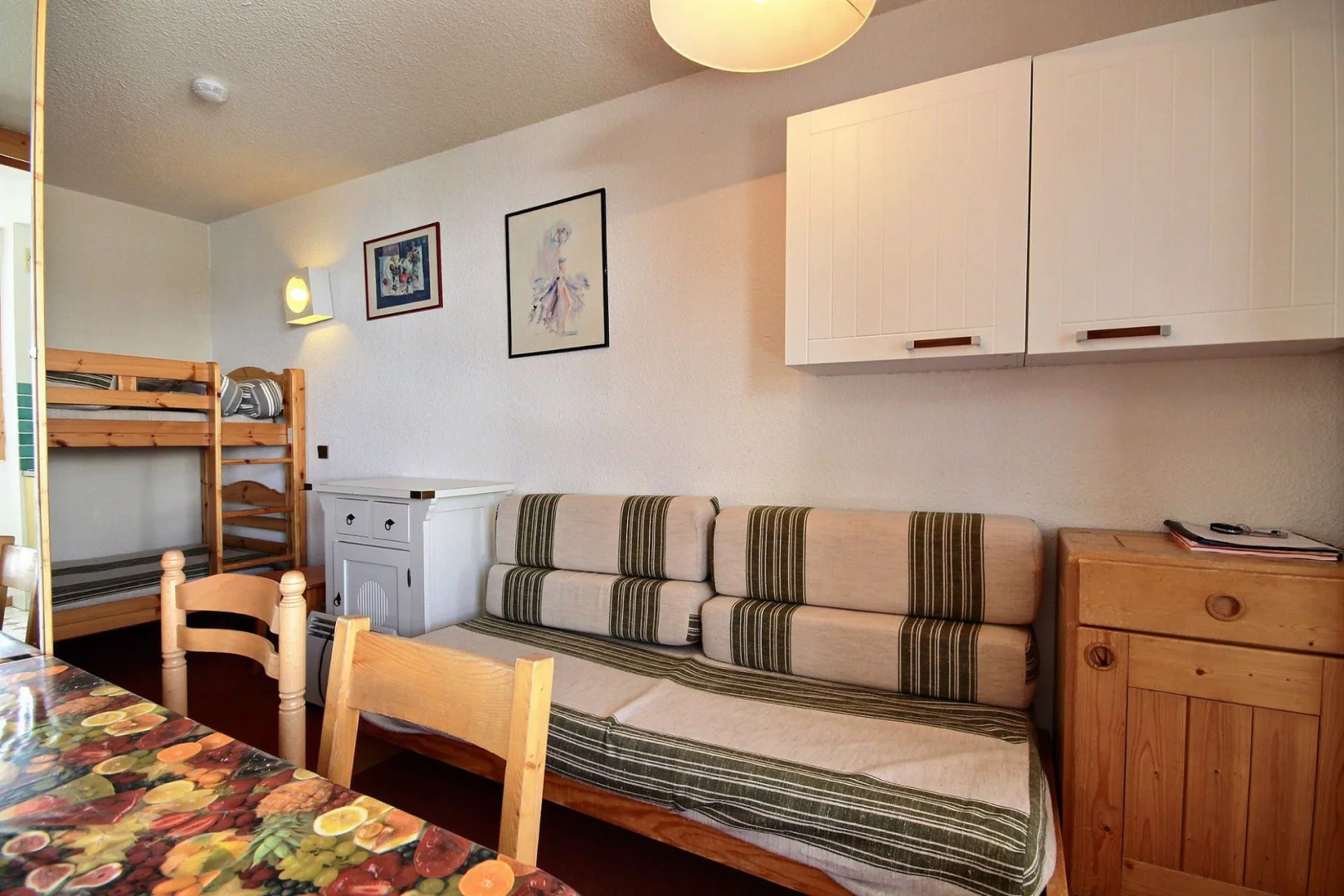 Séjour divisible : d'un côté 1 canapé-lit de 2 personnes, de l'autre coin cabine avec 2 lits superposés