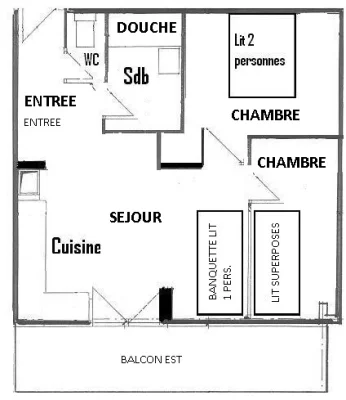 Chambre : 1 lit de 2 personnes 160 cm (ou 2 lits d'1 personnes x 80 cm)