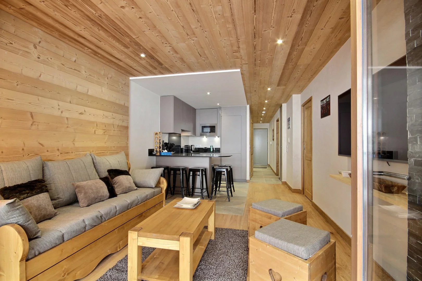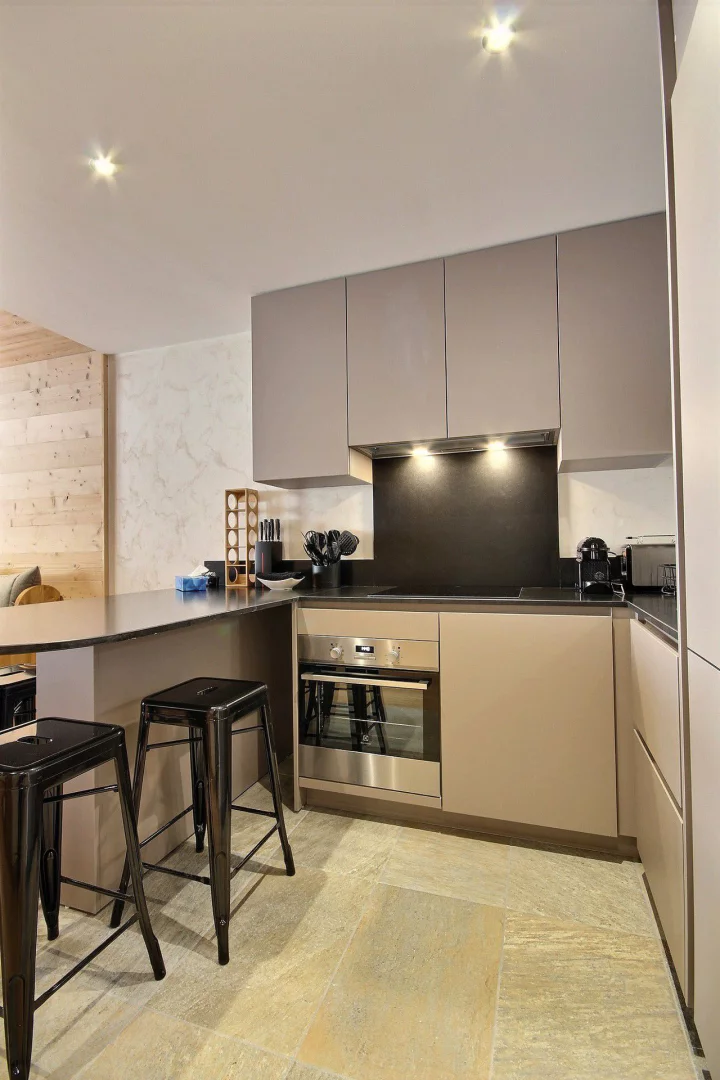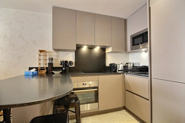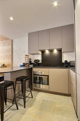 Coin cuisine ouvert sur le séjour : plaques à induction, four, réfrigérateur, lave-vaisselle, micro-ondes