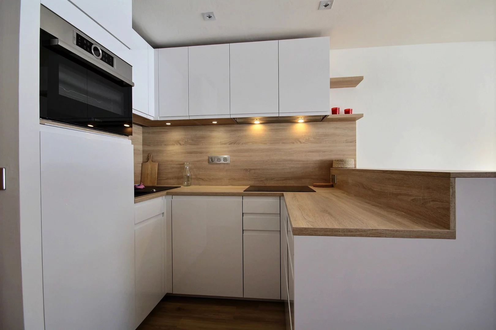 Cuisine ouverte sur le séjour entièrement équipée : plaques vitrocéramiques, four, réfrigérateur, lave-vaisselle, hotte aspirante