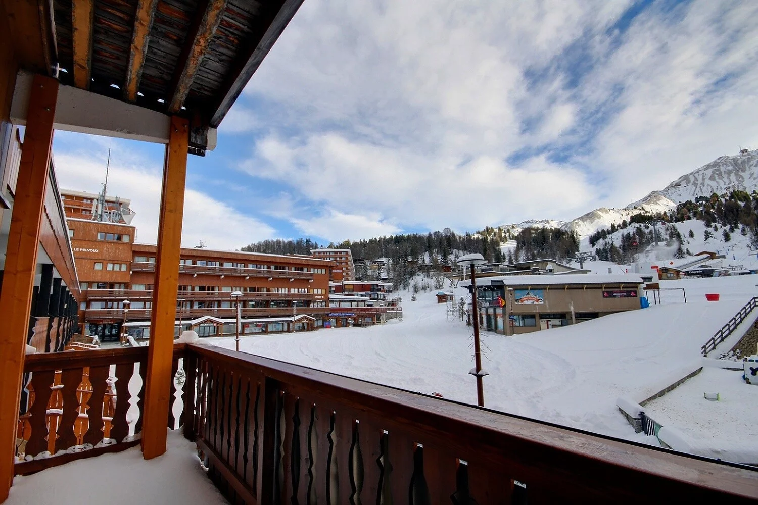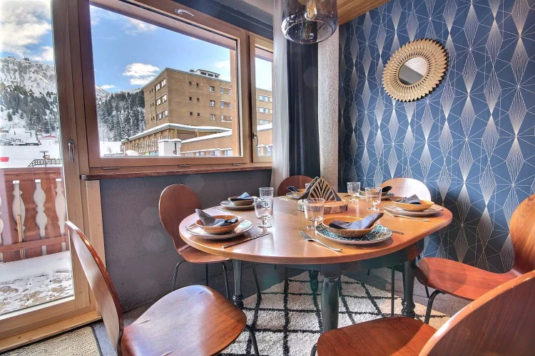 Appartement 3 pièces pour 5 personnes, orienté sud avec balcon, 1er étage, très belle vue sur le front de neige et le domaine skiable, sans ascenseur (entrée séparée de l'entrée principale du Jannu), accès par escalier, 1er étage
