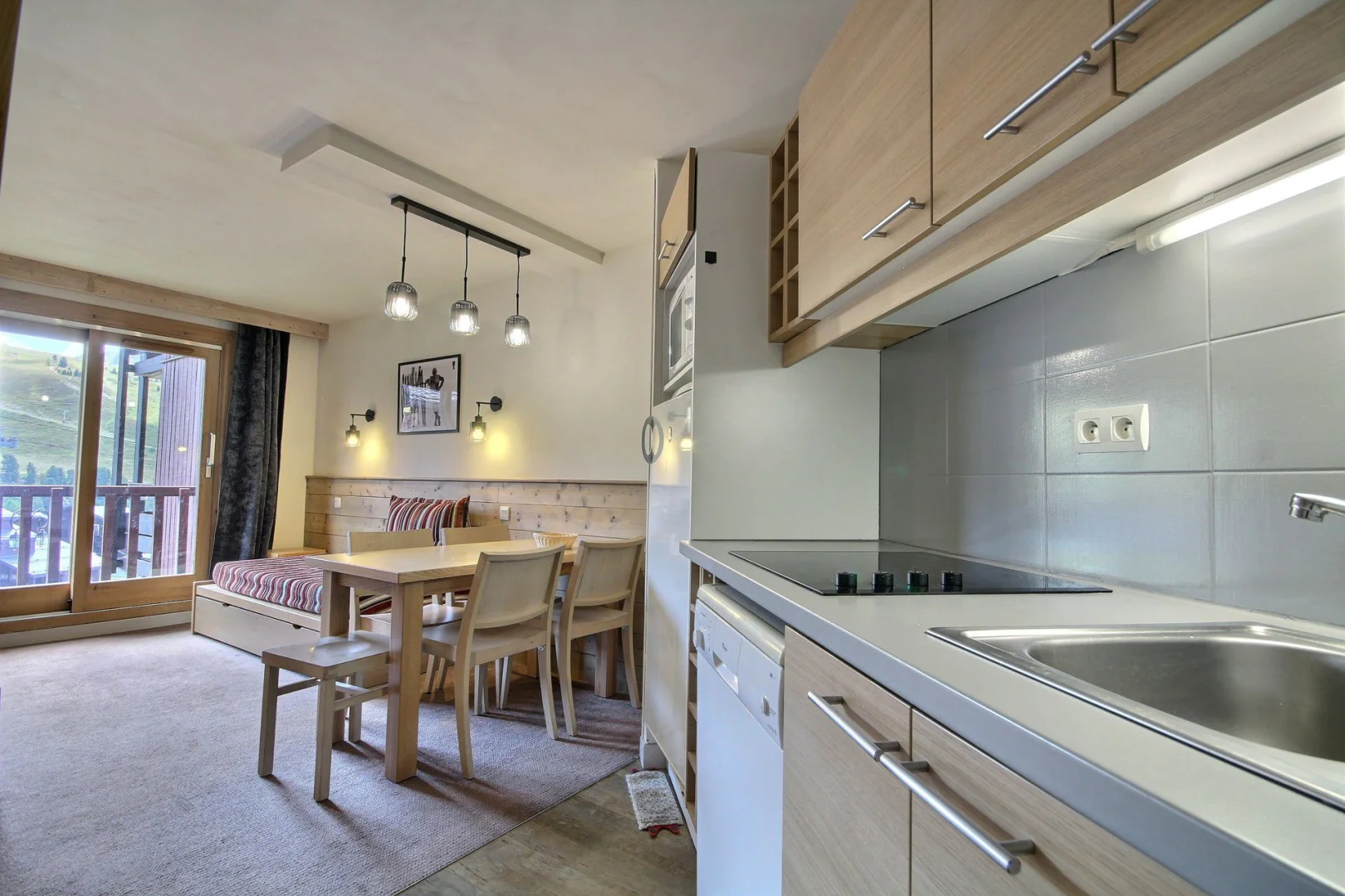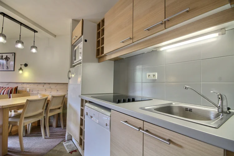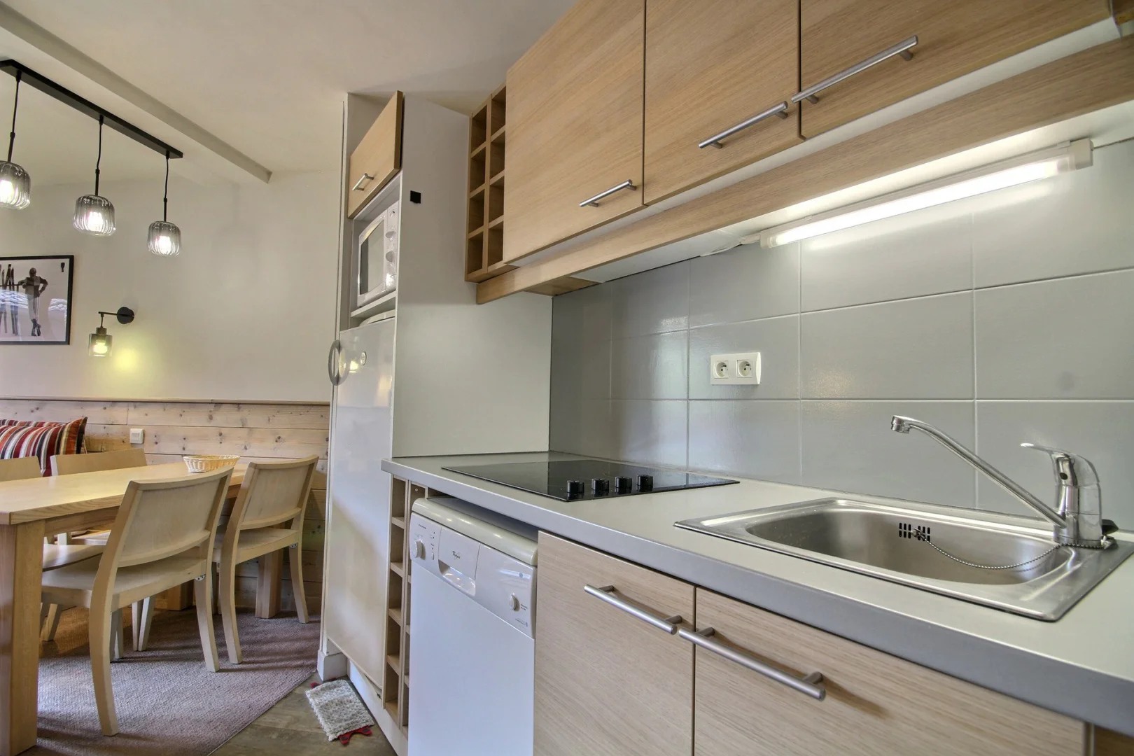 Coin cuisine équipé ouvert sur le séjour : plaques vitrocéramiques, four micro-ondes/grill, réfrigérateur, lave-vaisselle