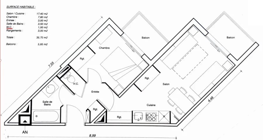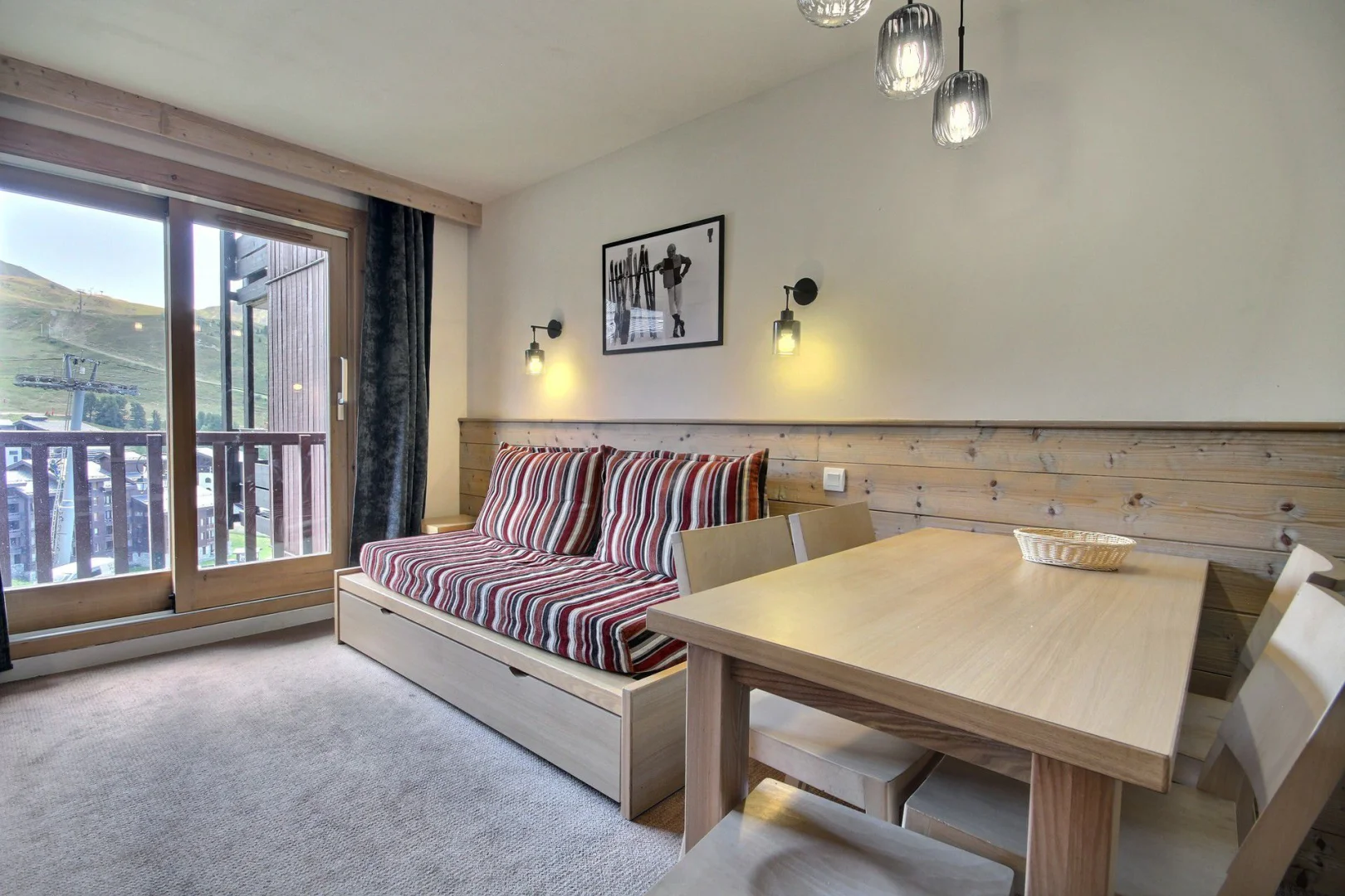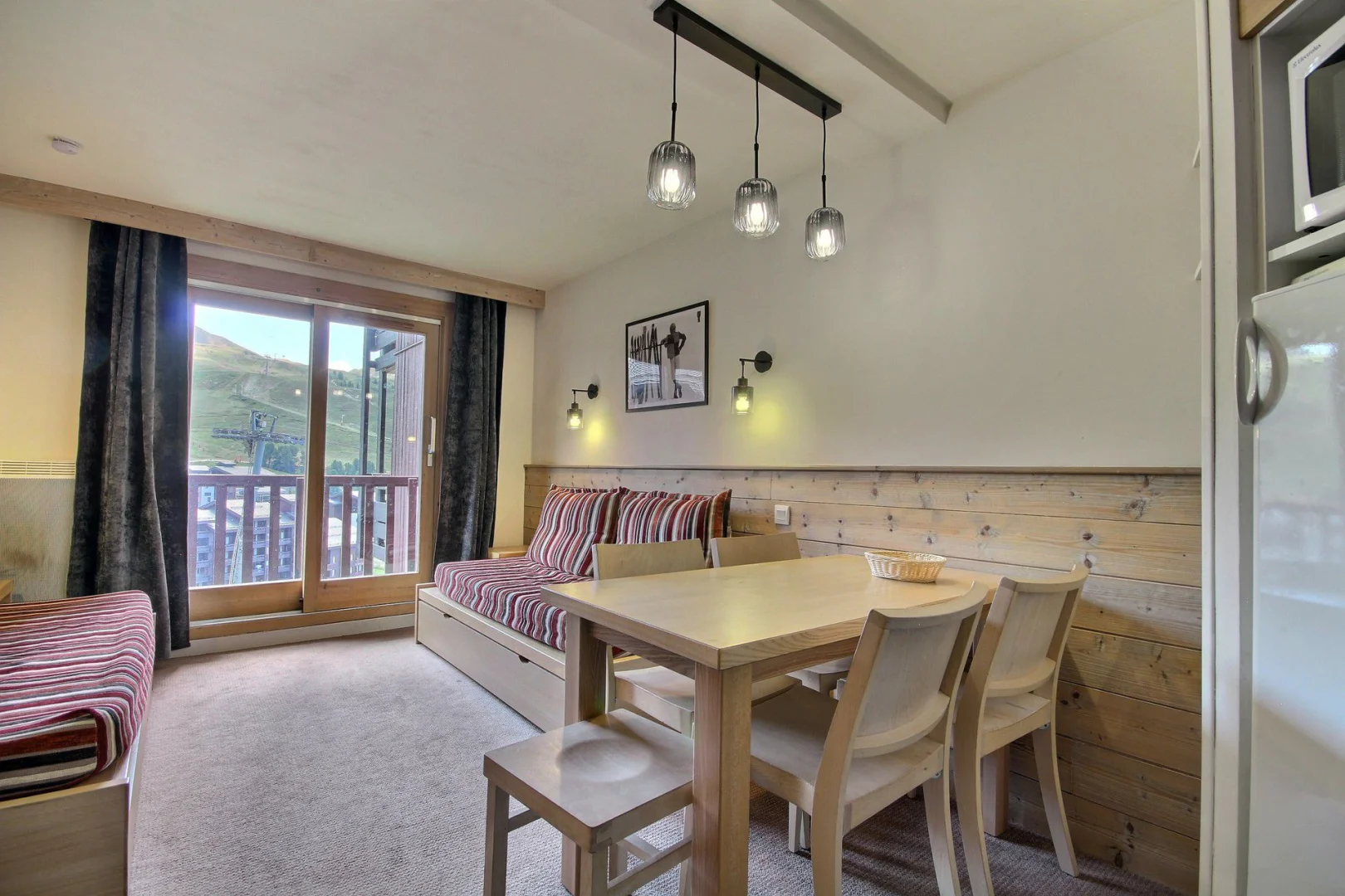Séjour ouvrant sur un balcon: 2 lits gigognes d'1 personne (80 cm), 1 banquette-lit d'1 personne (80 cm)