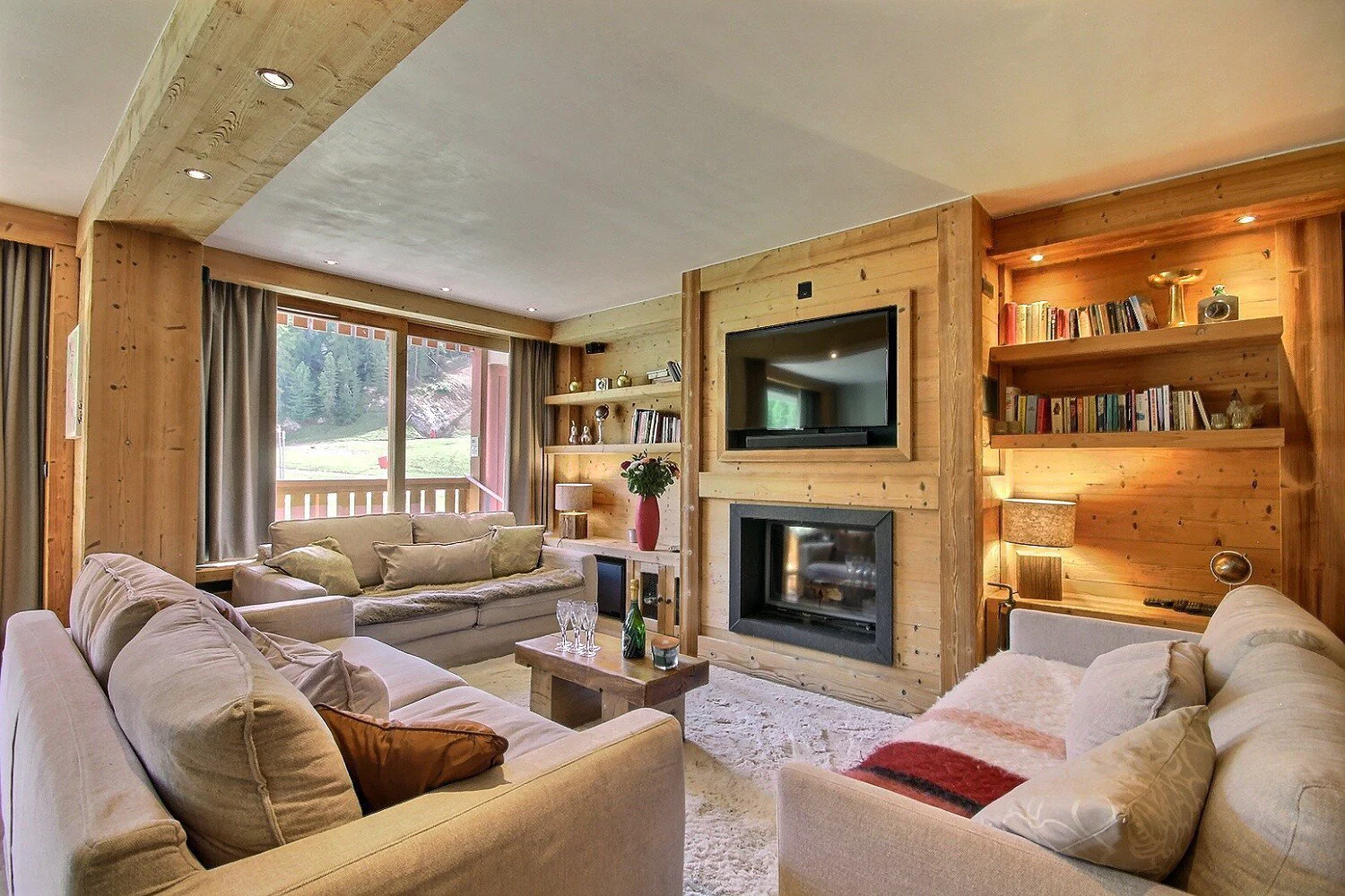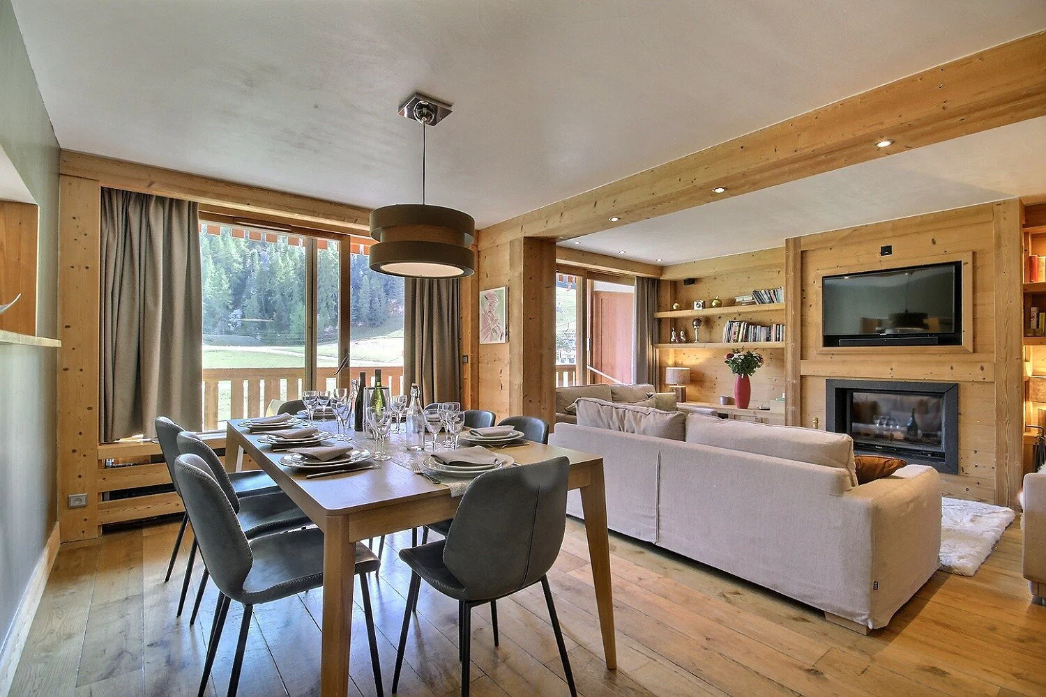 Vaste séjour salle à manger avec cheminée et télévision, système audio Bose