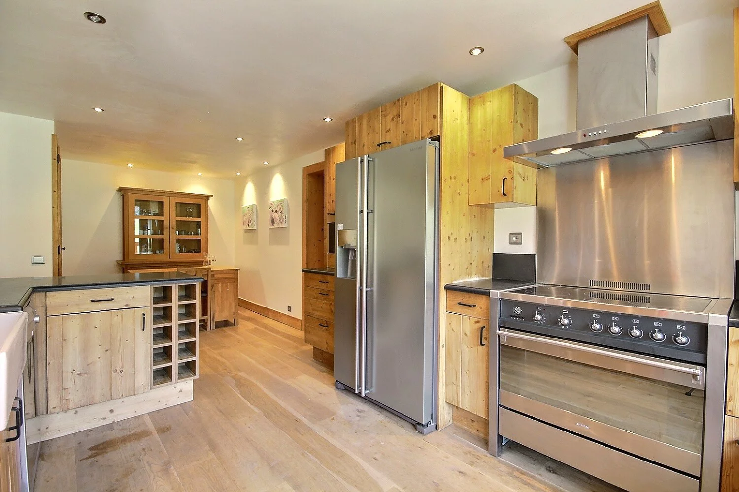 Cuisine entièrement équipée ouverte sur le séjour : plaques à induction, grand four, réfrigérateur/congélateur américain, lave-vaisselle, micro-ondes
