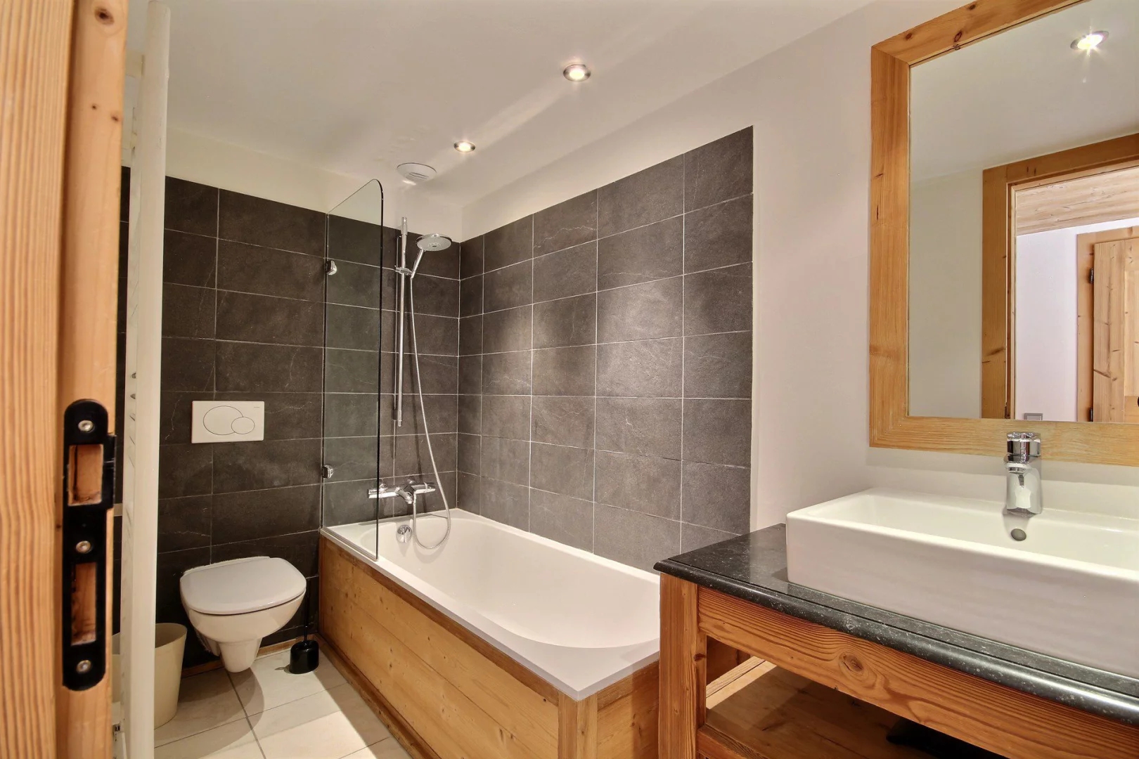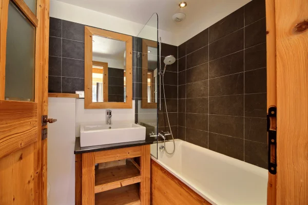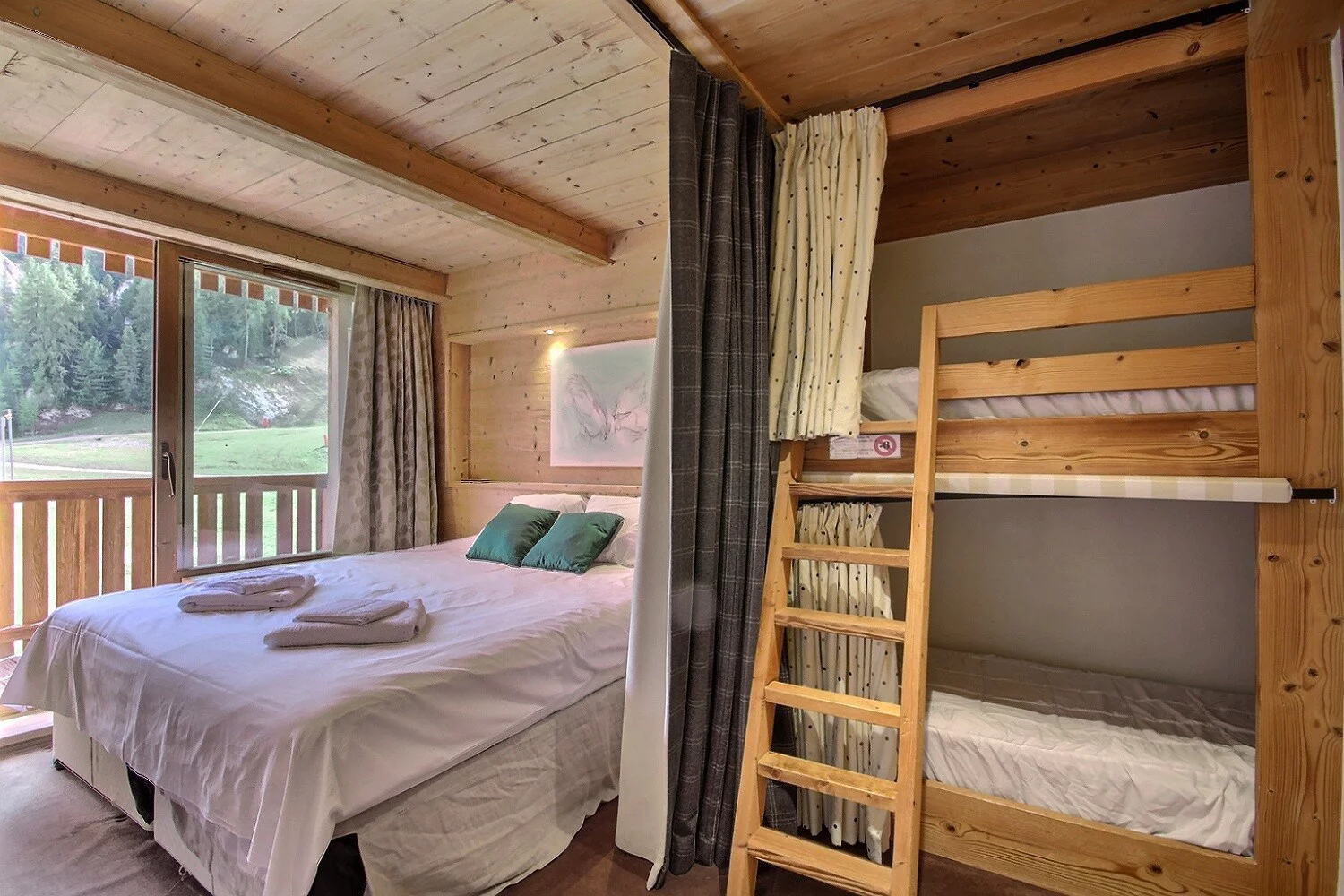 Chambre 1 ouvrant sur le balcon : 2 lits d'1 personne (90 cm) ou 1 lit de 2 personnes (180 cm), coin cabine avec 2 lits superposés - salle de bains avec baignoire et WC