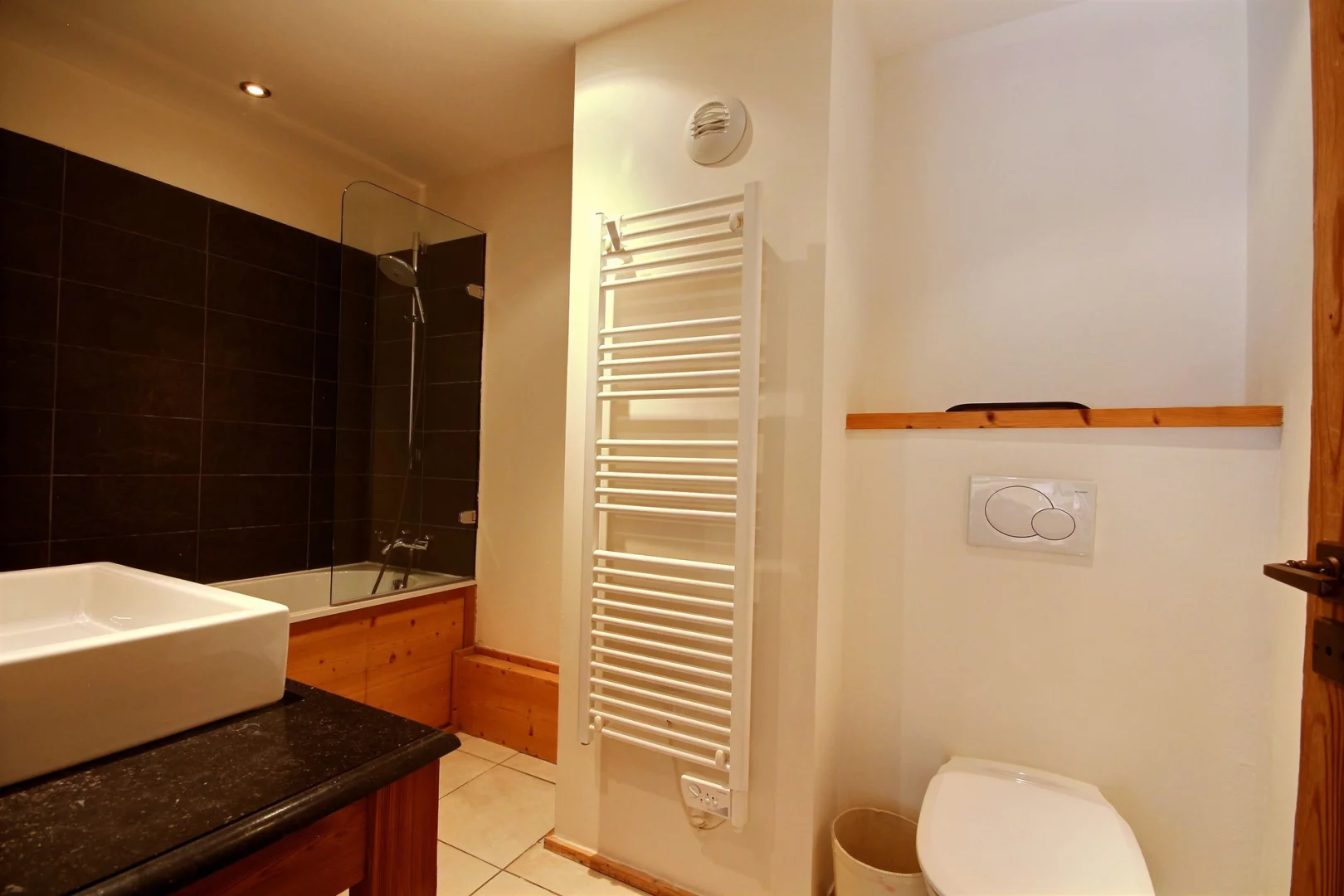Chambre 3 ouvrant sur le balcon : 1 lit de 2 personnes (160 cm) - salle de bains avec baignoire et WC