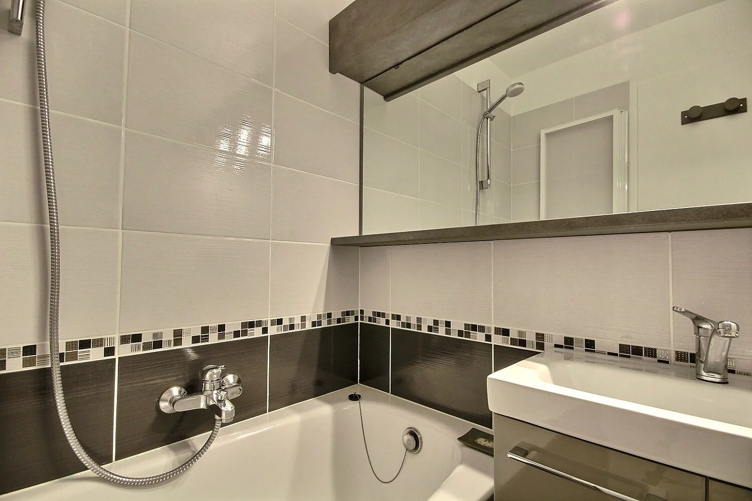 Coin cuisine équipé : plaques électriques, four combiné grill/micro-ondes, réfrigérateur, lave-vaisselle