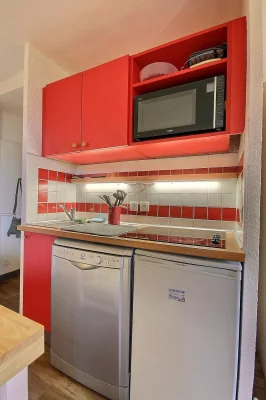 Coin cuisine ouvert sur le séjour : plaques vitrocéramiques, four micro-ondes/grill, régrigérateur, lave-vaisselle