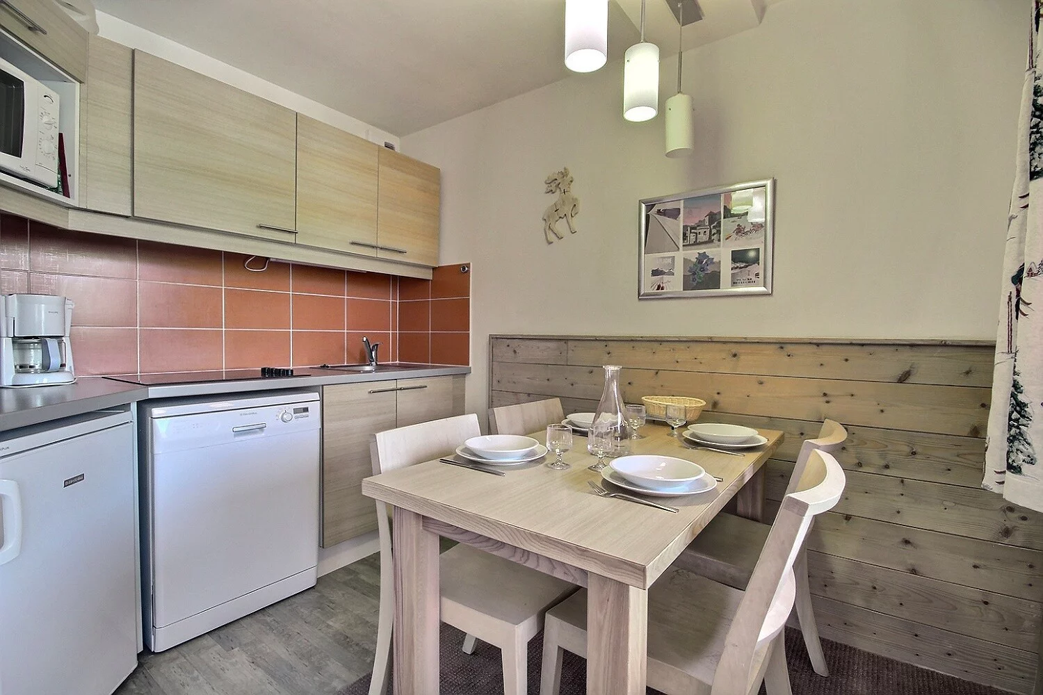 Coin cuisine équipé ouvert sur le séjour : plaques vitrocéramiques, four micro-ondes/grill, réfrigérateur, lave-vaisselle