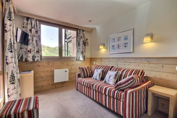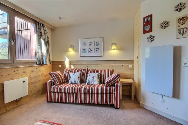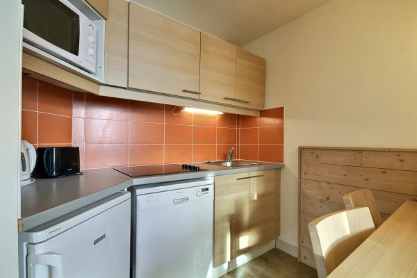 Grand studio-cabine équipé pour 4 personnes, orienté sud avec balcon, niveau 8 de la résidence, très belle vue sur la montagne