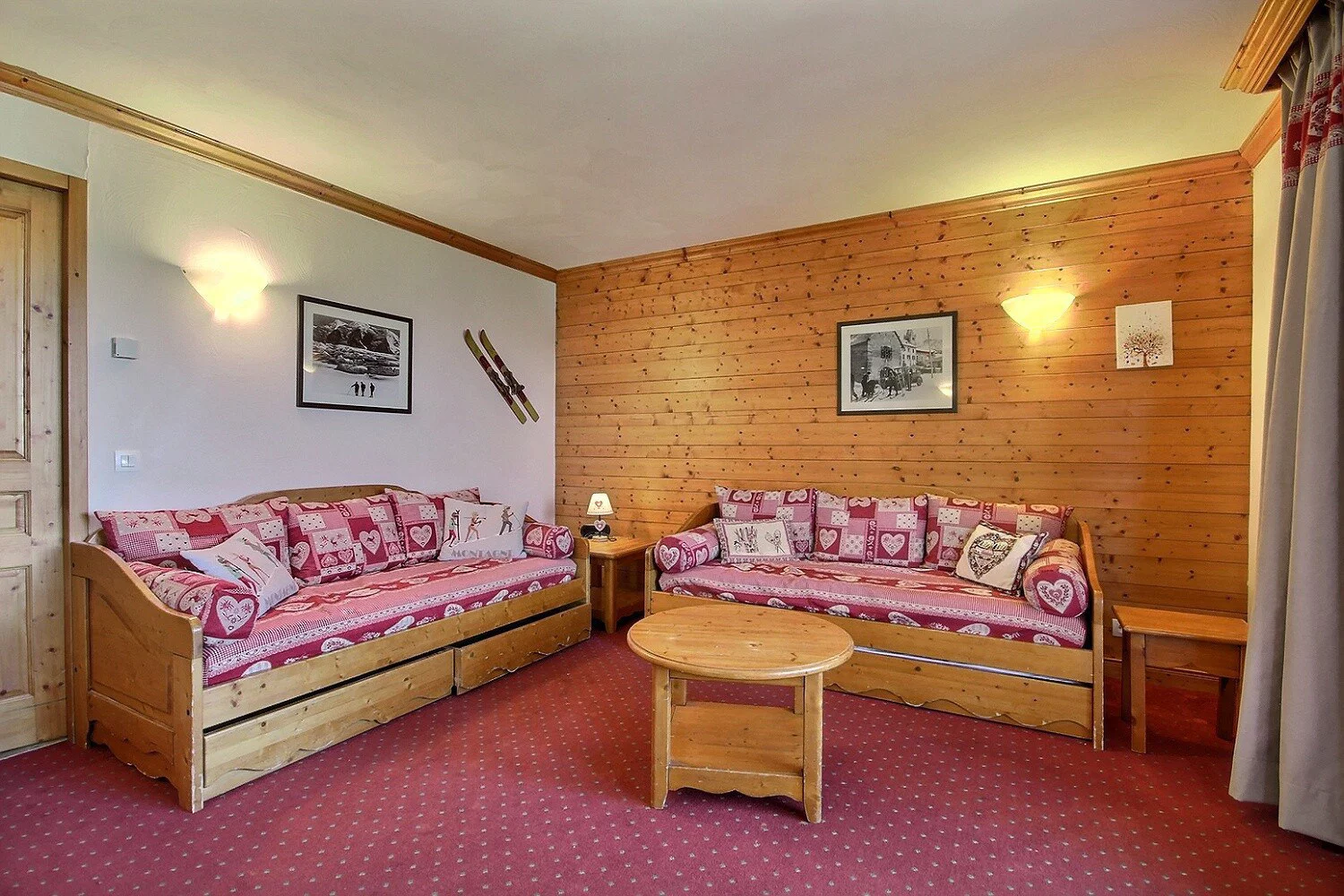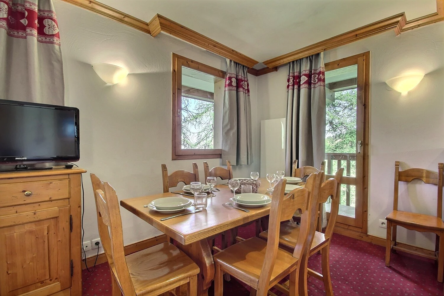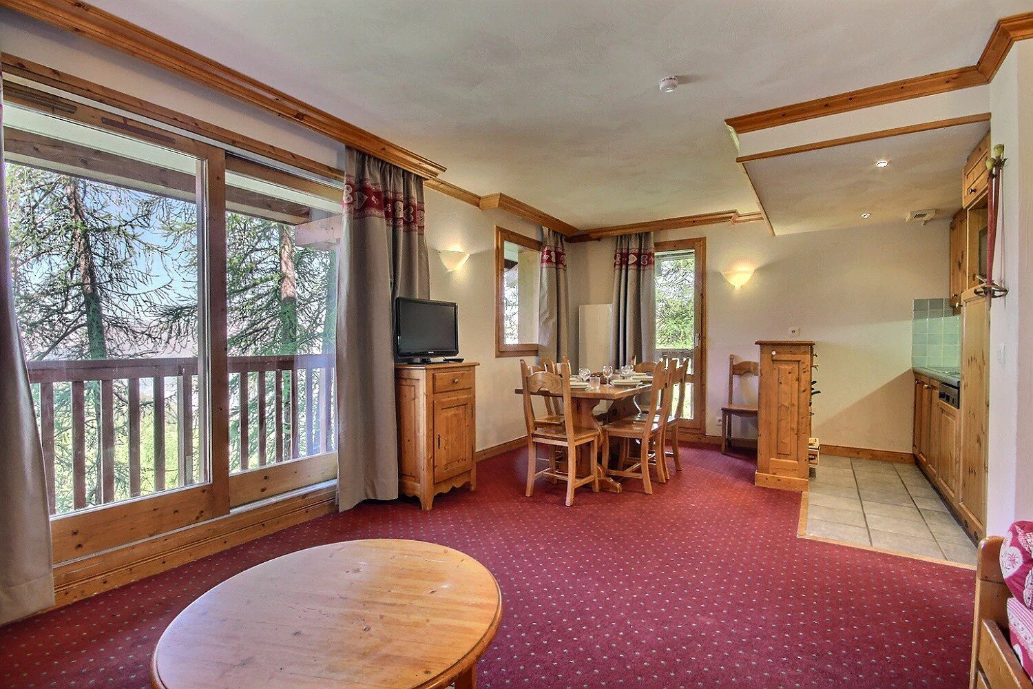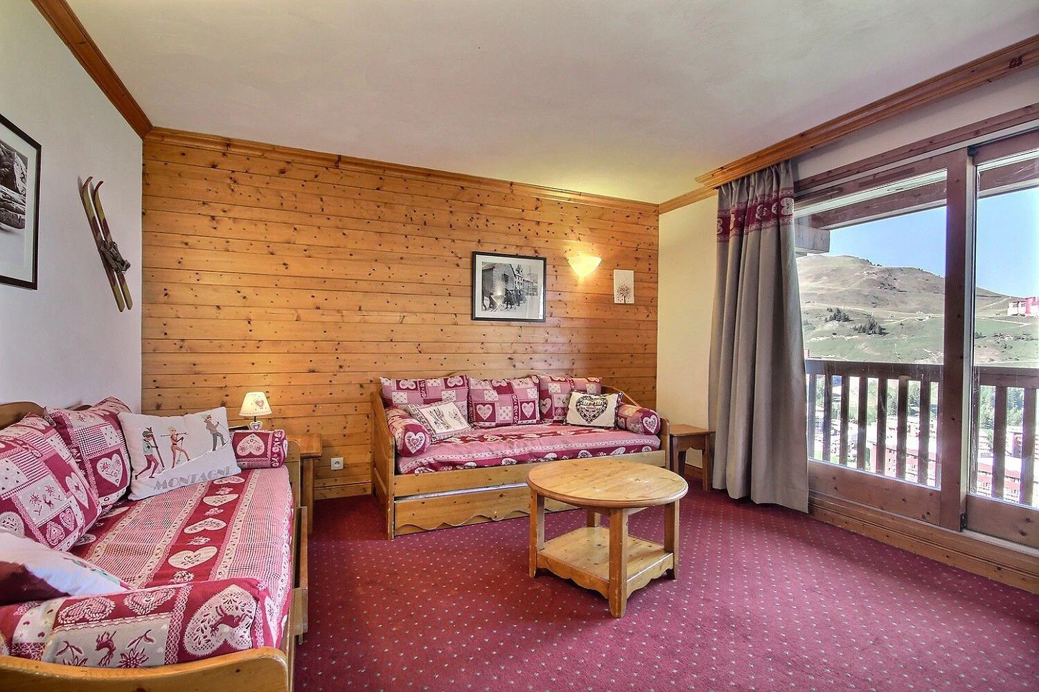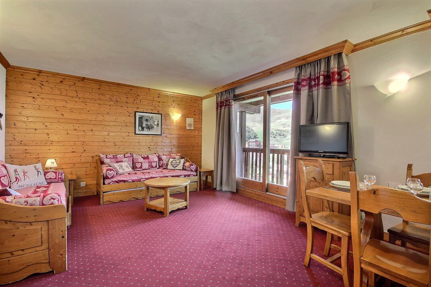 Séjour ouvrant sur un grand balcon d'angle : 2 banquettes-lits gigognes (2 couchages), coin repas pouvant accueillir 6 convives, télévision