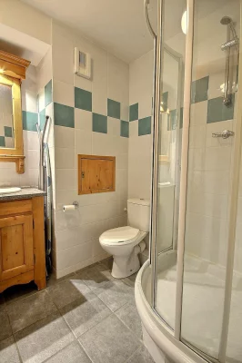 Chambre : 1 lit de 2 personnes (160 x 200 cm), salle de bains avec cabine de douche et WC