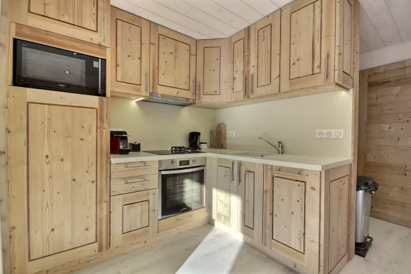 Cuisine ouverte sur le séjour : plaques induction/gaz, refrigérateur, lave-vaisselle, four, micro-ondes