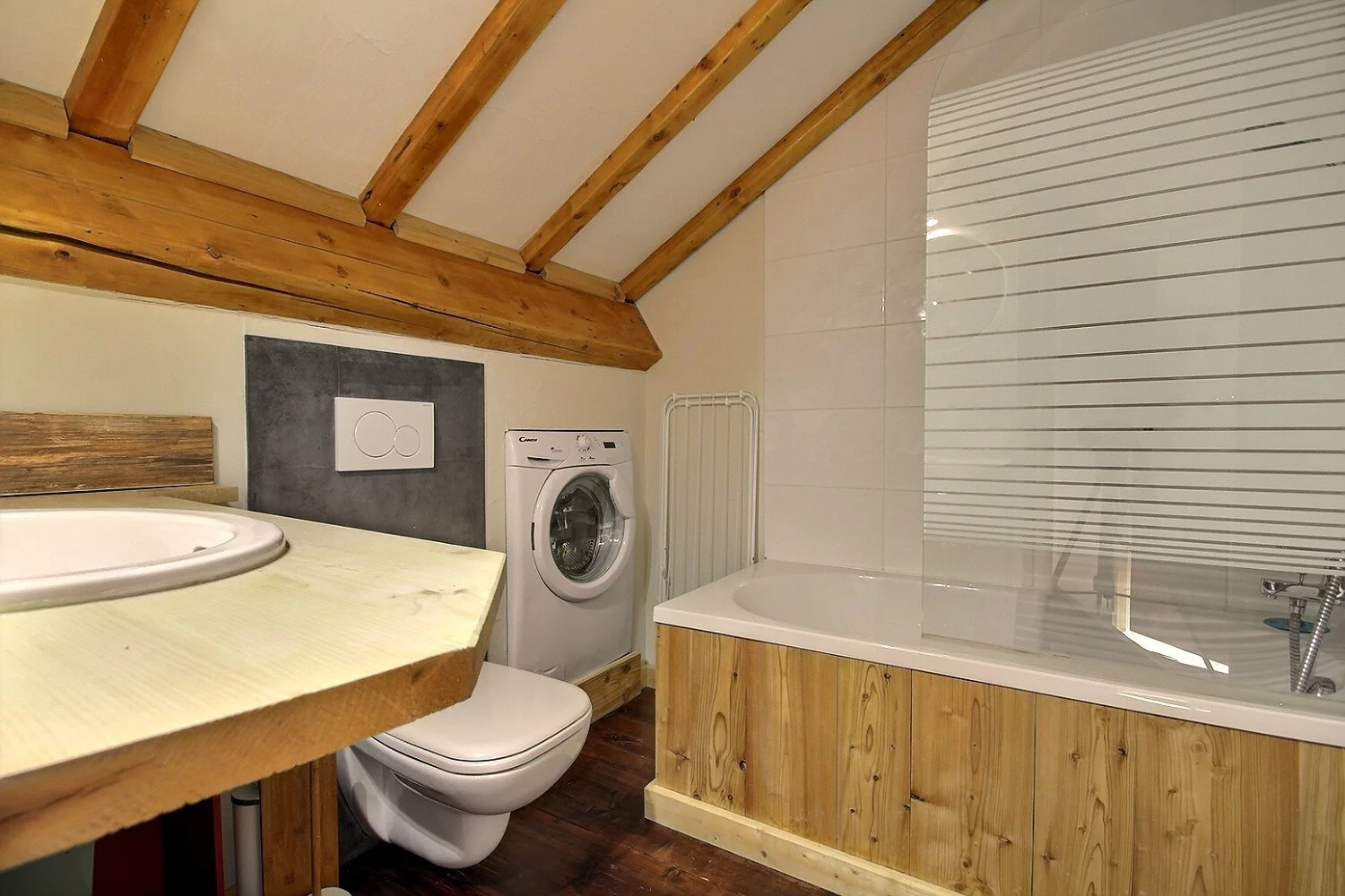 Salle de bains avec baignoire et WC, lave-linge