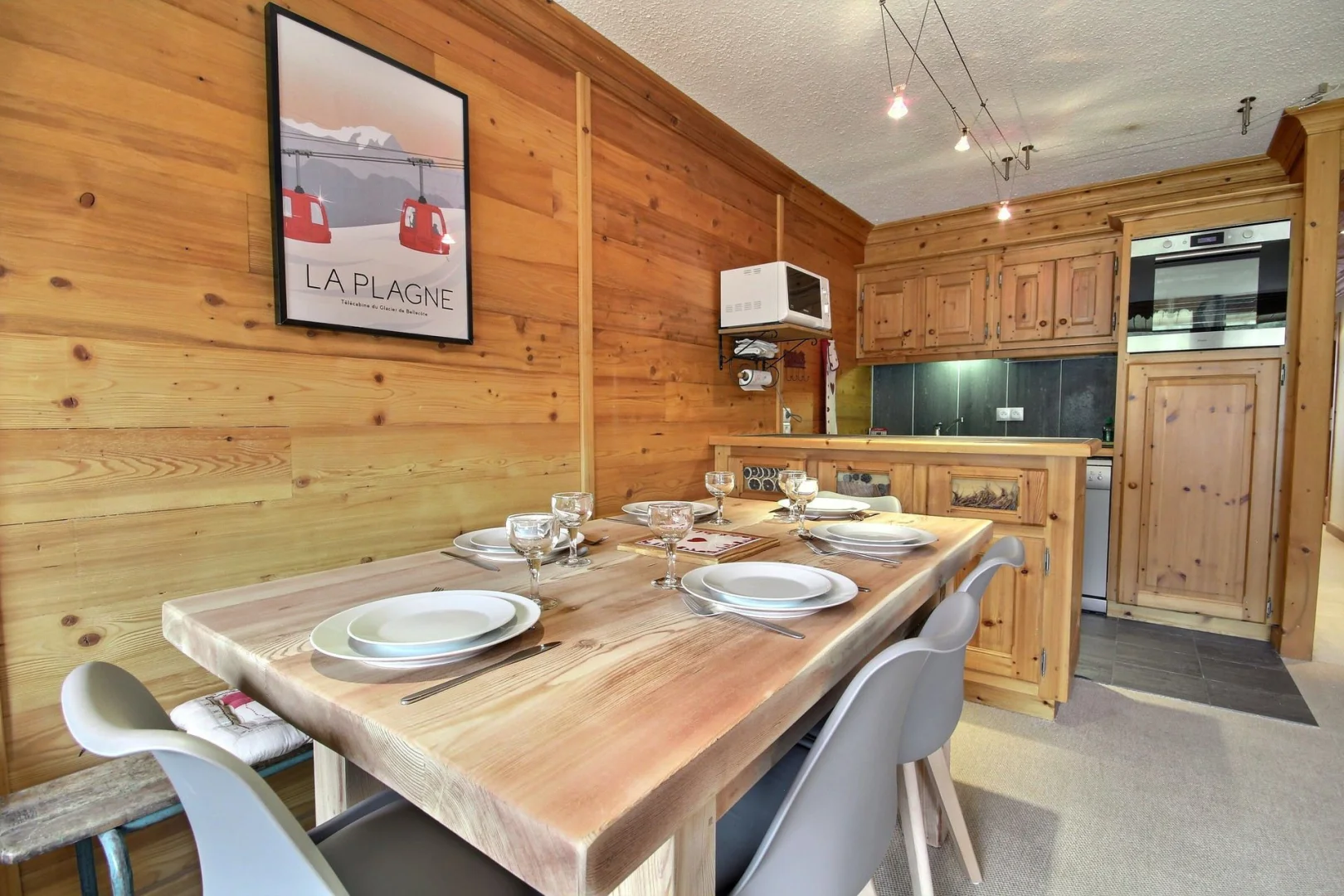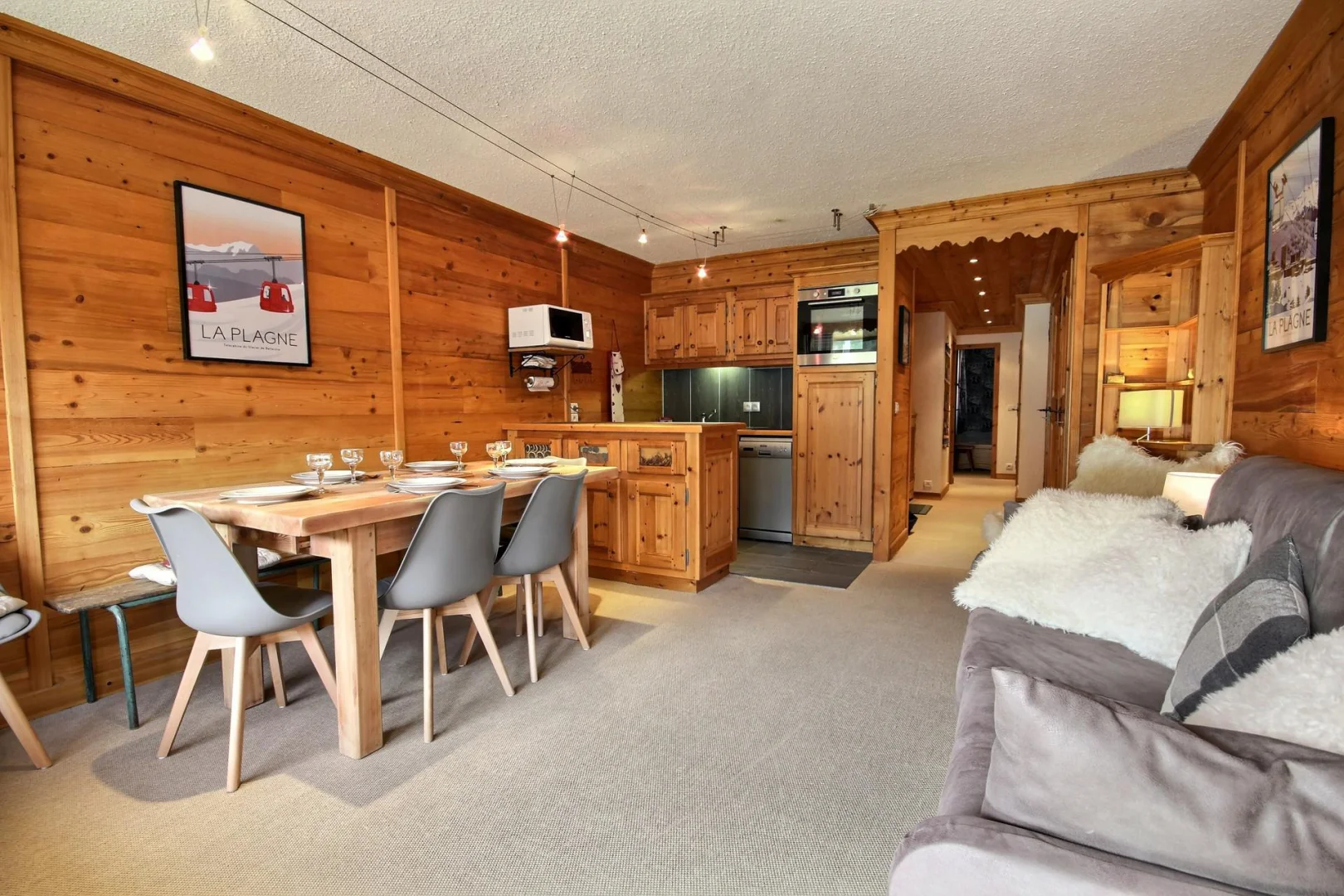 Coin cuisine ouvert sur le séjour : plaques vitrocéramiques, four, réfrigérateur, lave-vaisselle