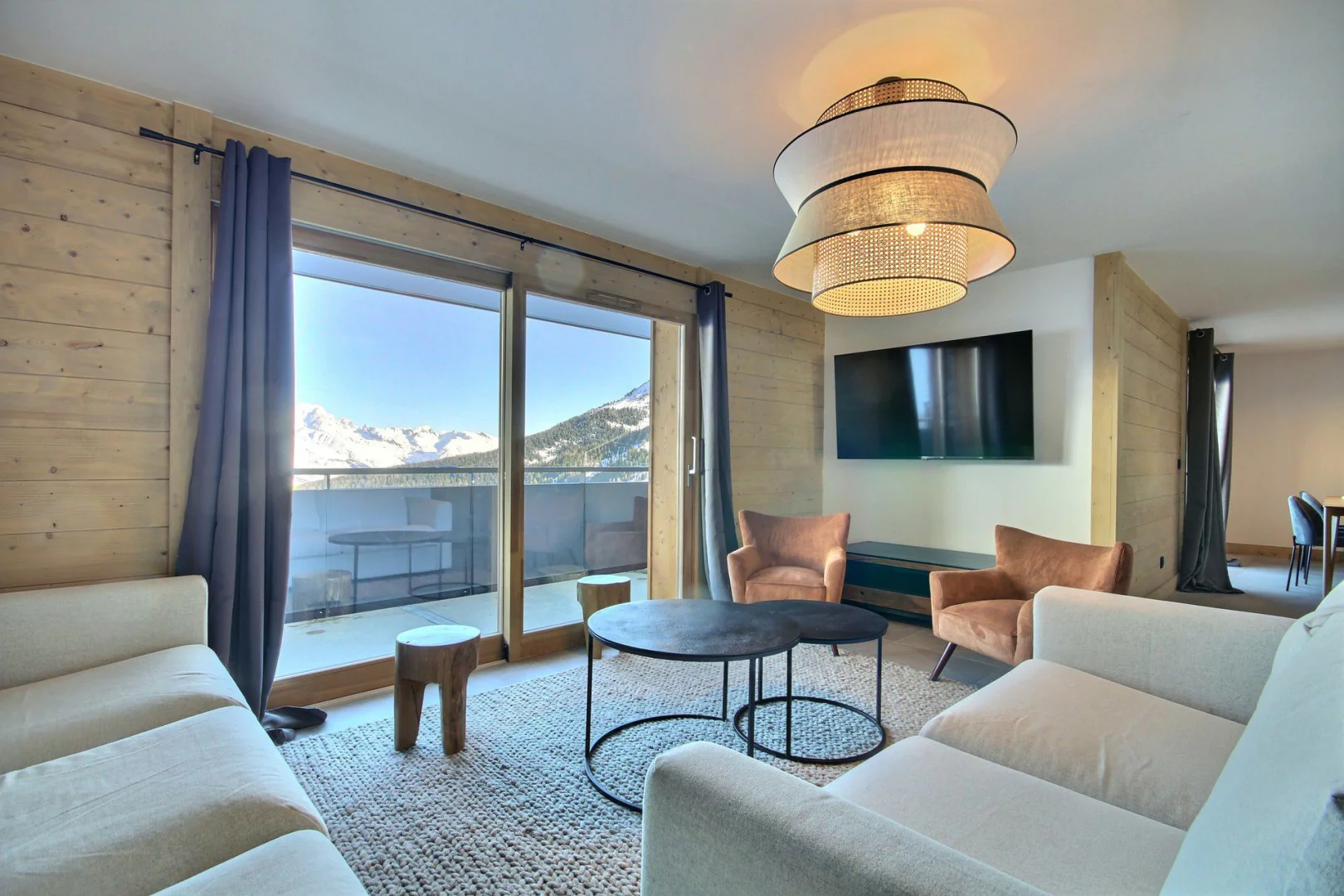 Vaste pièce à vivre ouvrant sur deux balcons (vue sur le Mont-Blanc) : coin repas, espace séjour avec télévision