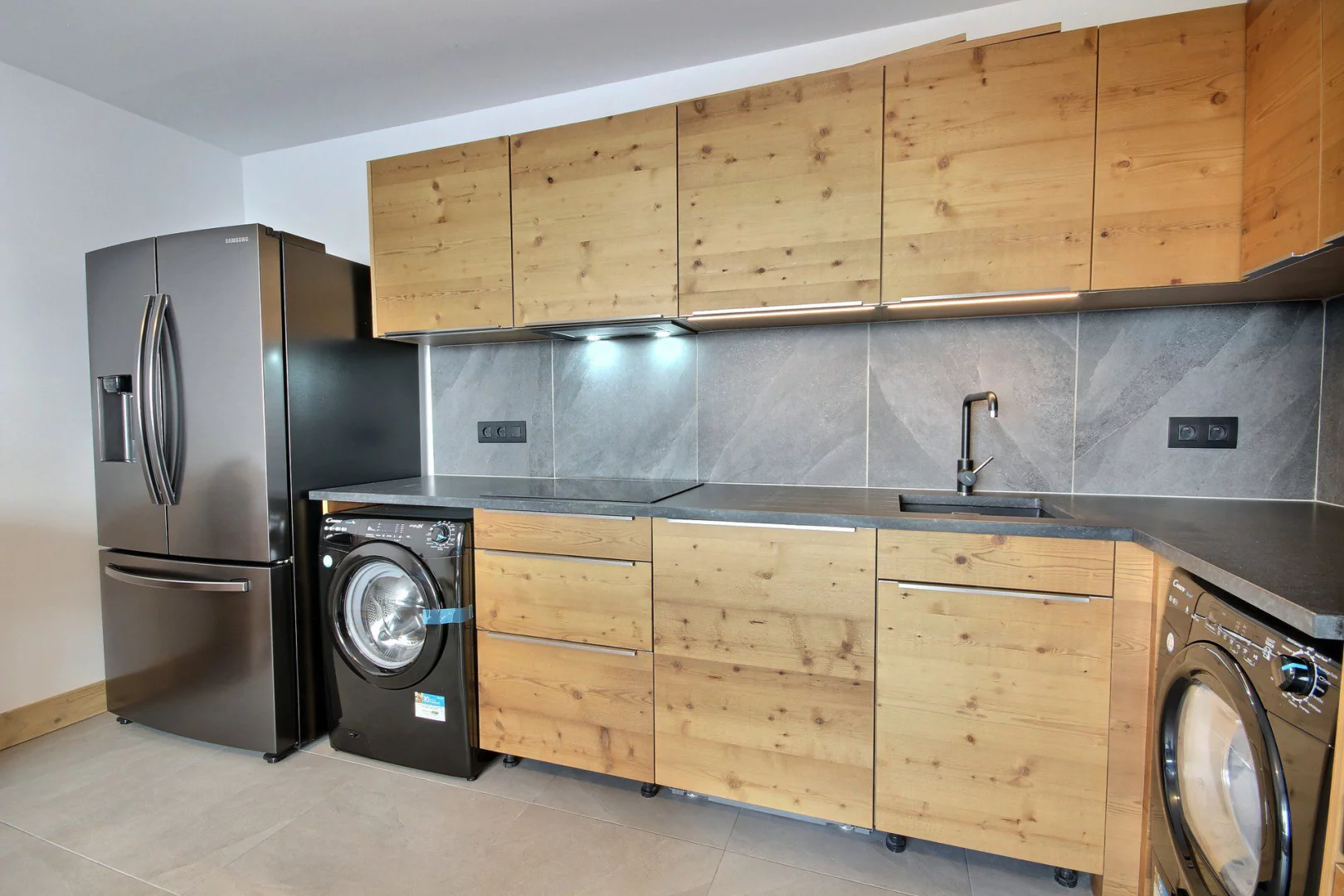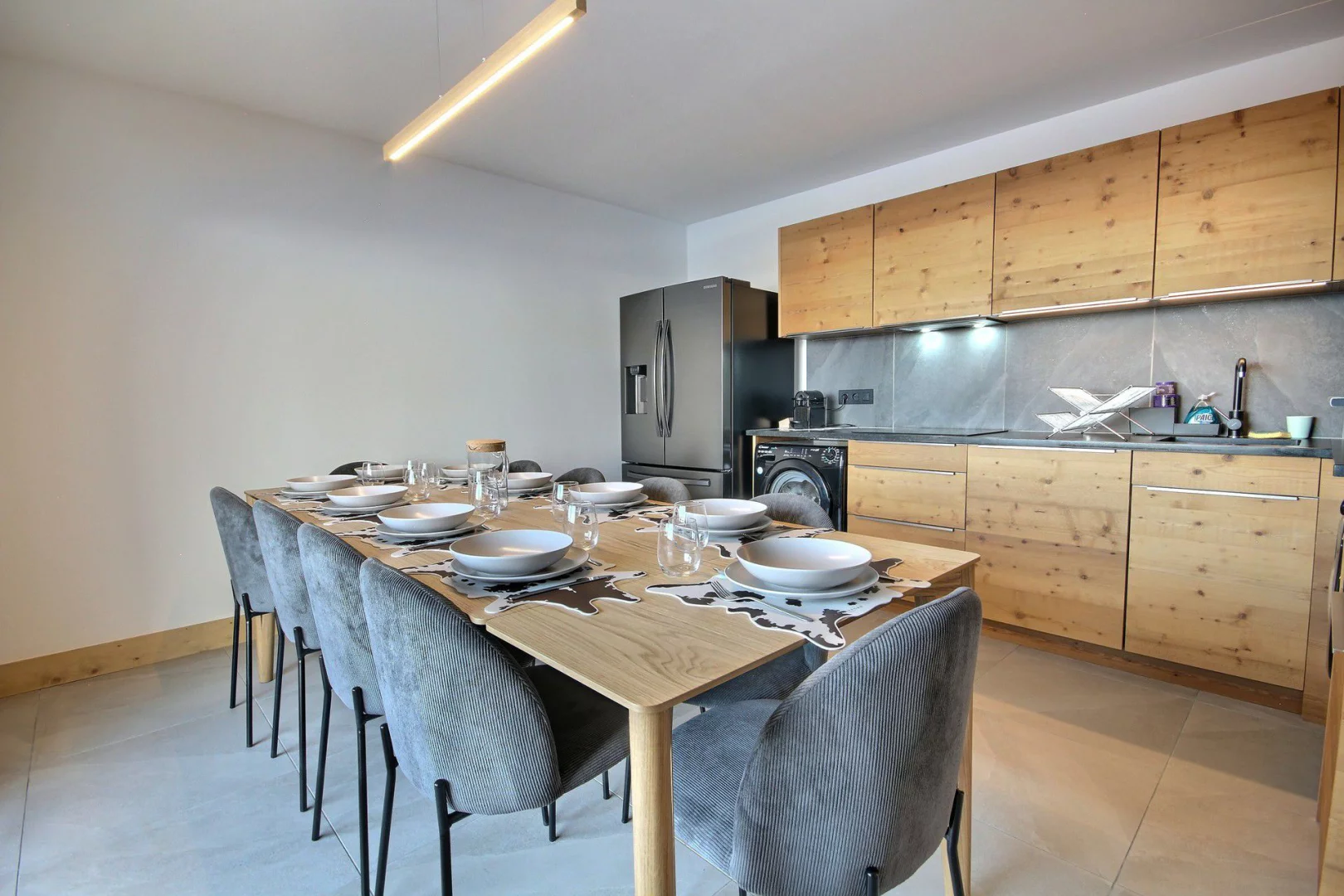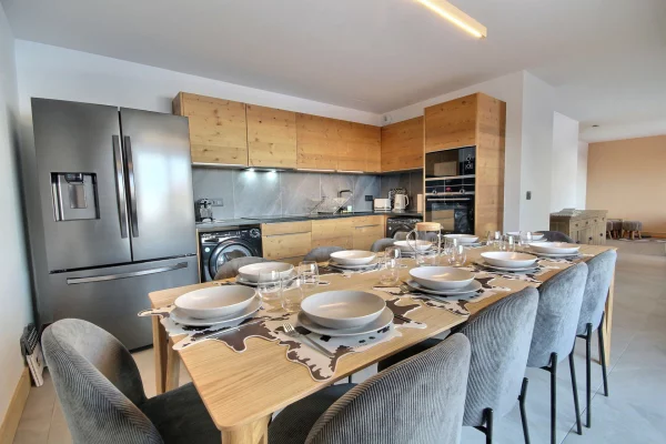 Cuisine entièrement équipée ouvrant sur le séjour : plaques induction, four, réfrigérateur/congélateur, lave-vaisselle, micro-ondes