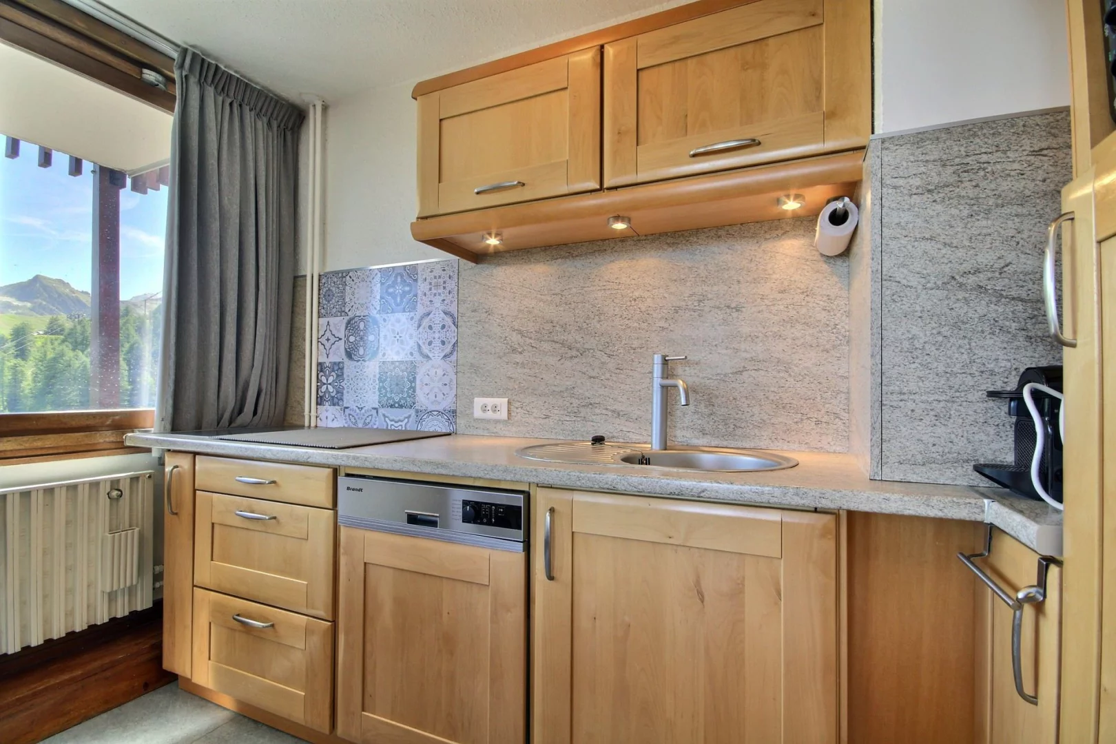 Cuisine équipée ouverte sur le séjour : plaques vitrocéramiques, four, réfrigérateur (avec compartiment freezer), lave-vaisselle, cafetière Nespresso