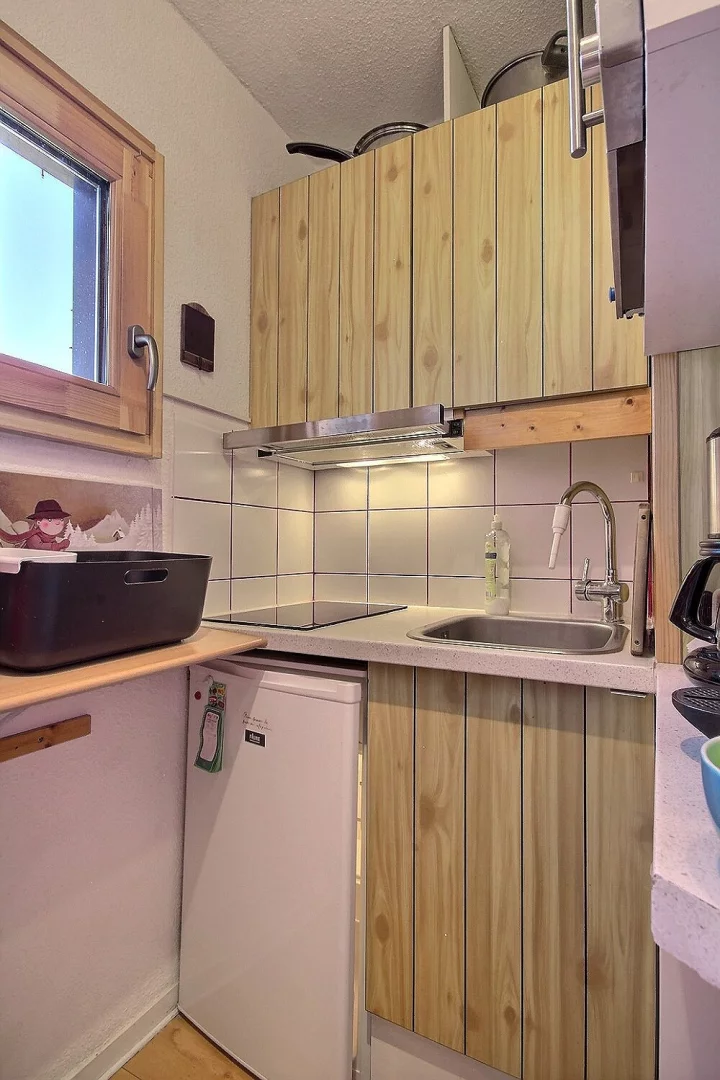 Kitchenette attenante au séjour (avec fenêtre) : plaques vitrocéramiques, micro-ondes, réfrigérateur