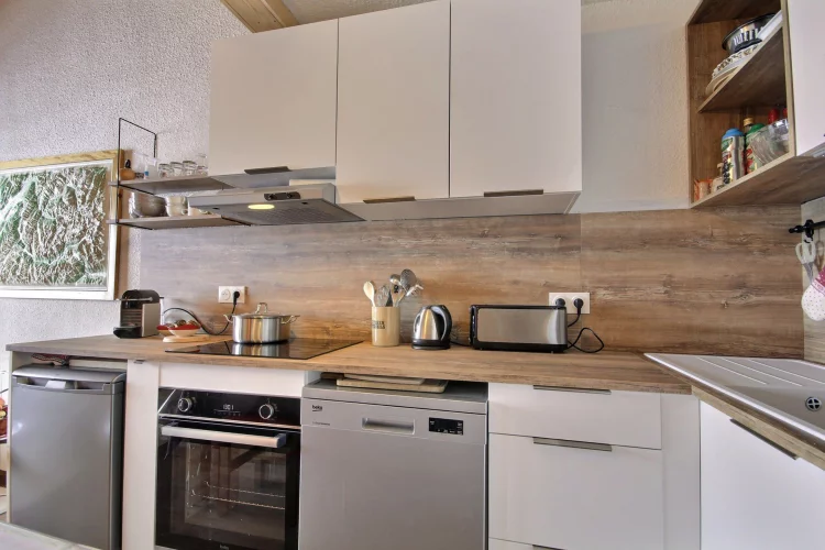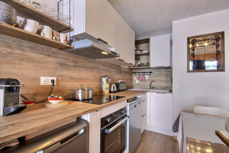 Coin cuisine équipé ouvert sur le séjour : plaques vitrocéramiques, four, réfrigérateur, lave-vaisselle, micro-ondes, hotte aspirante
