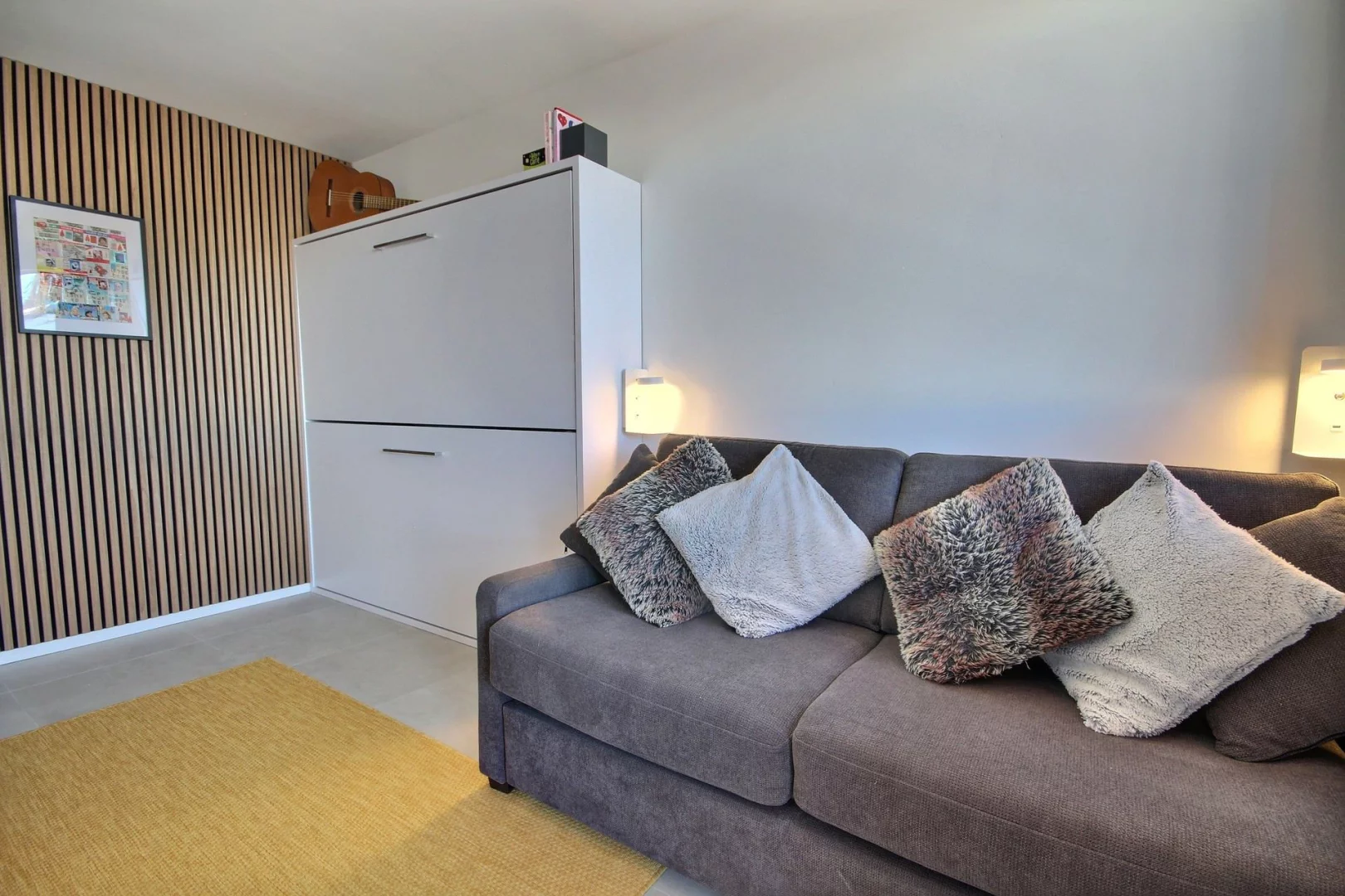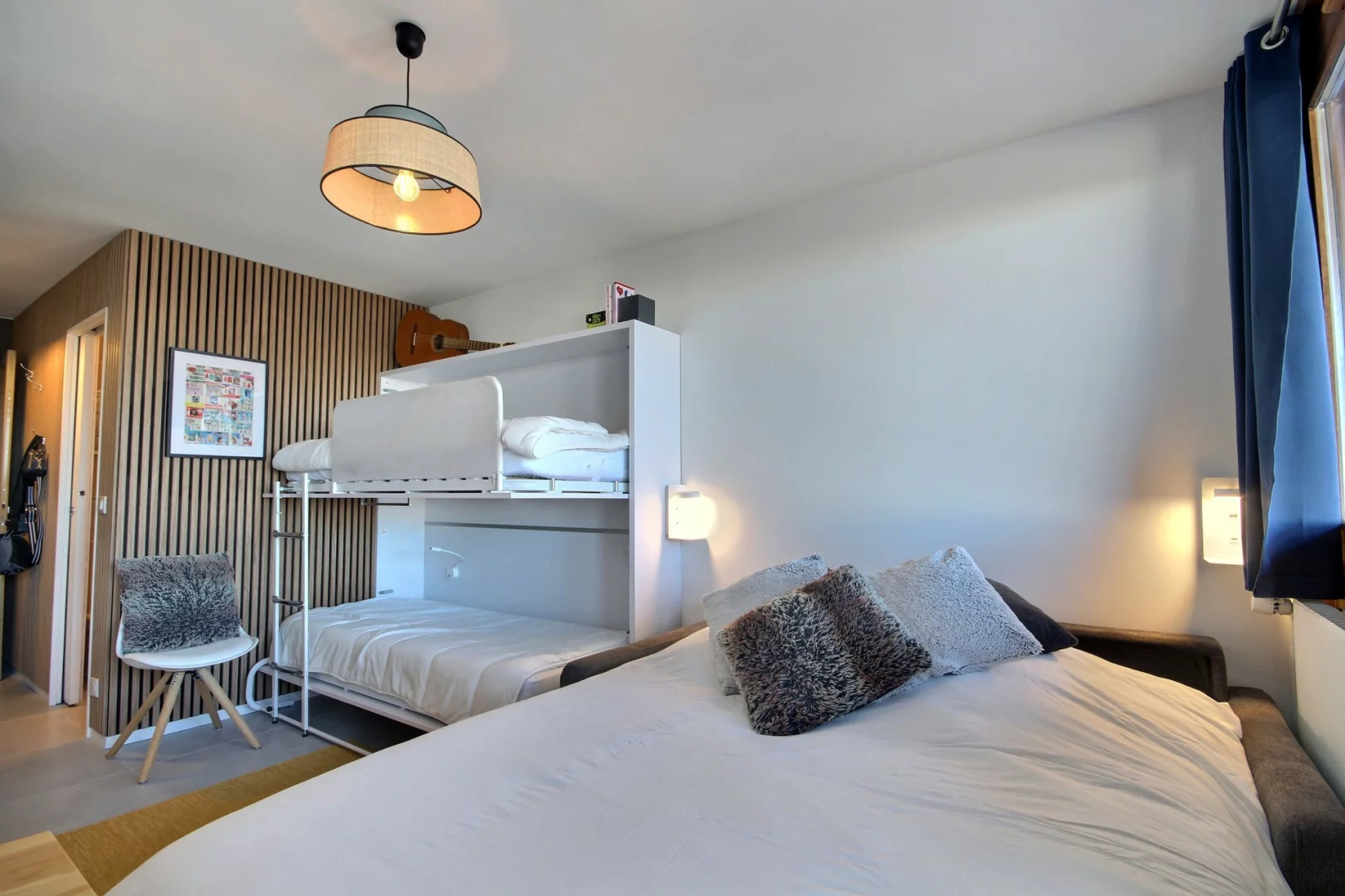 Séjour ouvrant sur le balcon : 1 canapé-lit de 2 personnes, 2 lits rabattables d'1 personne (dont un en hauteur, convenant pour un enfant), coin repas, télévision