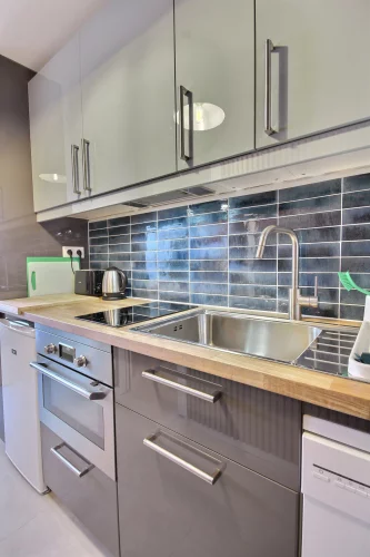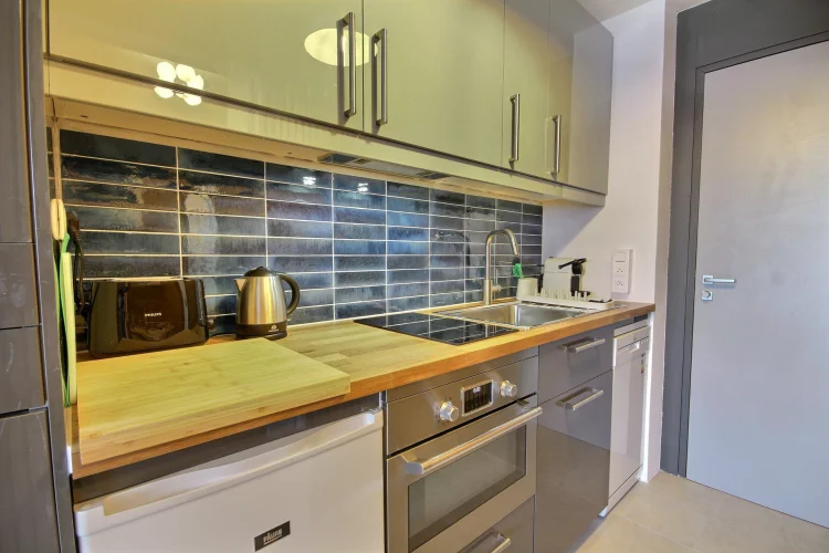 Coin cuisine dans l'entrée : plaques à induction, four mixte (grill/micro-ondes), réfrigérateur, lave-vaisselle