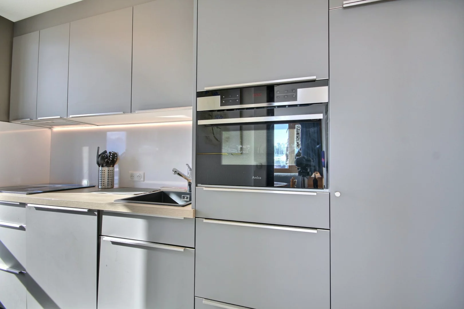 Cuisine entièrement équipée ouvrant sur la terrasse : plaques vitrocéramiques, four, réfrigérateur, lave-vaisselle